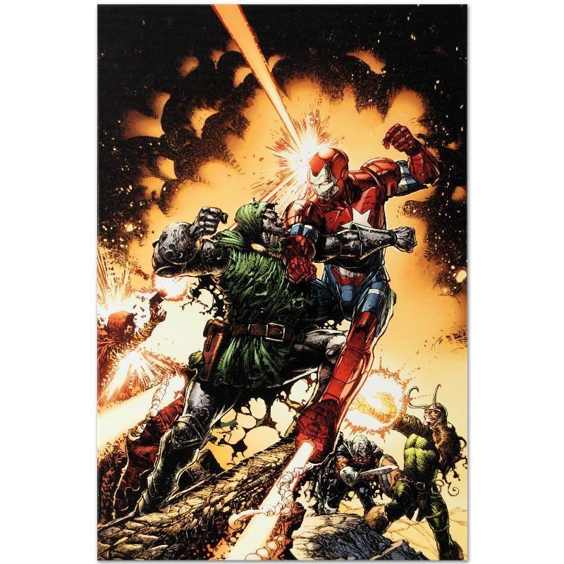 A piece of comic book history, this limited edition, from original art by David Finch, depicts an epic battle between Iron Patriot and Dr. Doom. In 2003, Finch came to Marvel Comics for a year-long arc on Ultimate X-Men, after which he began work on The Avengers and thereafter The New Avengers. He has also worked on such titles as Captain America, Spider-Man and the Hulk. "Siege: The Cabal #1" is a limited edition giclee on canvas by David Finch presented by Marvel Comics. This piece comes gallery wrapped. Includes Certificate of Authenticity! Measures approx. 18" x 27" (image).