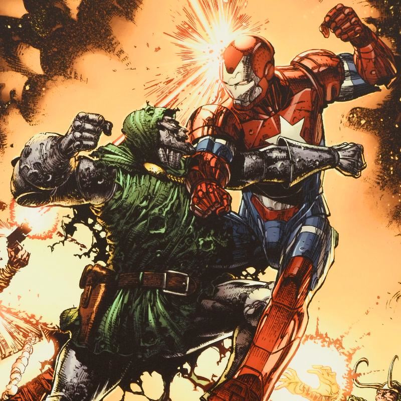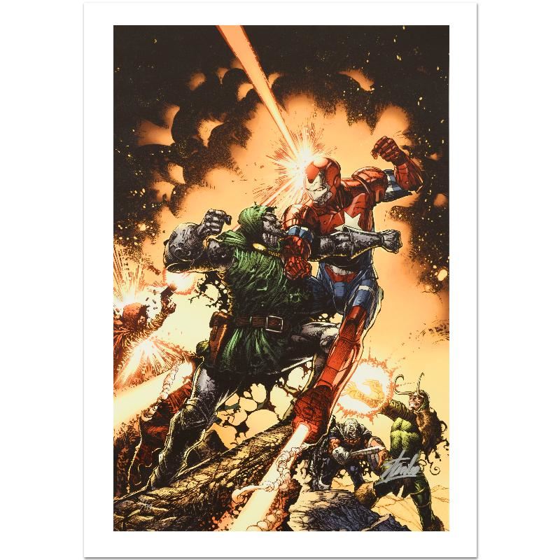 A piece of comic book history, this limited edition, from original art by David Finch, depicts an epic battle between Iron Patriot and Dr. Doom. In 2003, Finch came to Marvel Comics for a year-long arc on Ultimate X-Men, after which he began work on The Avengers and thereafter The New Avengers. He has also worked on such titles as Captain America, Spider-Man and the Hulk. "Siege: The Cabal #1" is a limited edition giclee on canvas by David Finch presented by Marvel Comics, numbered and hand signed by the great Stan Lee! Includes Certificate of Authenticity! Measures approx. 18" x 27" (image).