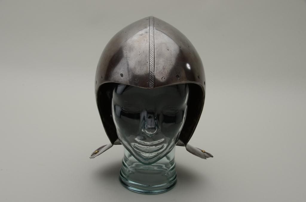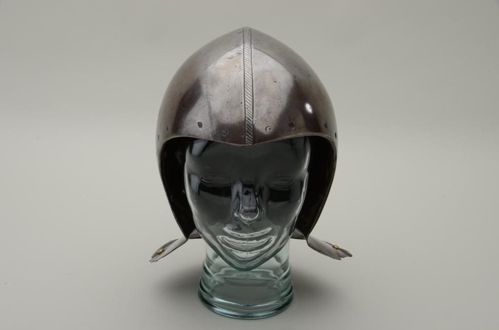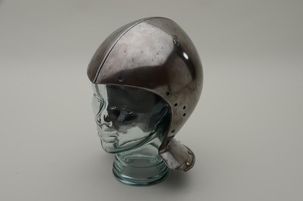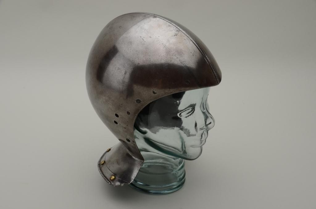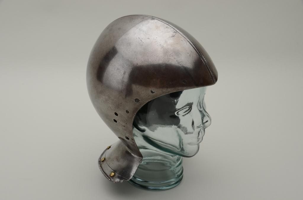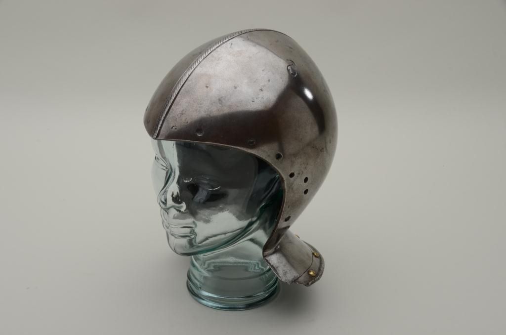 Siege weight bassinet skull from 15th to early 16th century, European closed helmet showing high quality forging by armorer. The comb is nicely formed and shaped and shows a serrated decoration. The helmet shows verythick forged metal plates and the bowl is made in 2 pieces seemed at the center. There are brass studs as decoration around the back edge and the rim is decorated to match the comb. There is a plume holder affixed to therear of the helmet and the interior shows very early forging and handwork. The helmet weighs approximately 10+ pounds. The front portion of this helmet shows drilled holes where there was a face piece or visor wasattached. Absolutely authentic to the mid-15th or very early 16th century. Est.: $6,000-$12,000.