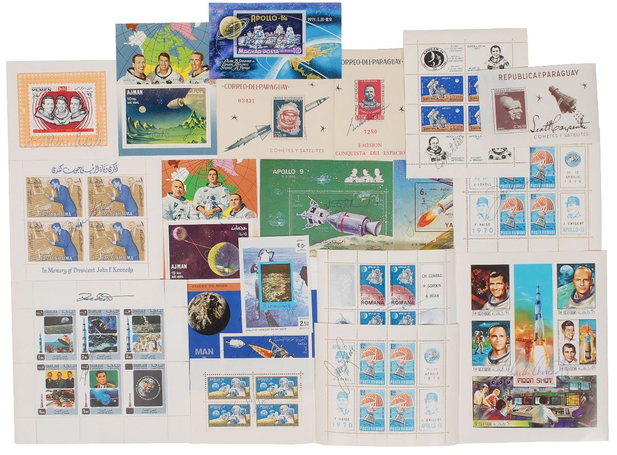 Near-complete set of nineteen Sieger stamps representing the Mercury and Apollo missions, each signed by one of the mission's astronauts, including: Scott Carpenter, John Glenn, Wally Schirra, Gordon Cooper, Rusty Schweickart, Alan Bean, Frank Borman, Charles Conrad, Dave Scott (signed twice), James Lovell, Jack Swigert, Donn Eisele, Ed Mitchell, Gene Cernan, Stu Roosa, Walt Cunningham, James McDivitt, Tom Stafford, and Richard Gordon. In fine condition. With only the Armstrong needed to complete the set, this is a desirable compilation of these famous philatelic pieces.