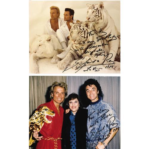 <B>Siegfried and Roy Signed Photos.</B></I> Two color 8" x 10" photos signed by the famous magicians to Kaye Ballard, who can be seen standing with them in one of the photos, dated 1988. In Excellent condition. <I>Accompanied by LOA from PSA/DNA.</B></I><BR><BR><b>Shipping:</b> Flat Material, Small (<a target="_blank" href="http://www.heritageauctions.com/common/shipping.php">view shipping information</a>)