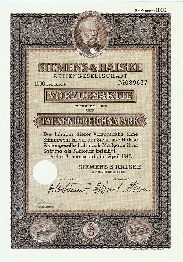 1942, Berlin, Germany. Stock certificate. Brown/Tan. Vignette of bust of Werner von Siemens at top center and electormechanical equipment at bottom. The Siemens & Halske Telegraph Building Company was founded in 1847 by Werner Siemens and Johan Georg Halske, along with Siemens cousin, Johan Georg Siemens. It quickly became one of the most dynamic companies in the electrical industry and withing a few decades was one of the largest electro-mechanical companies on the globe, a position it still holds today. A superb certificate for display from this world class company. Uncancelled and in Excellent condition.