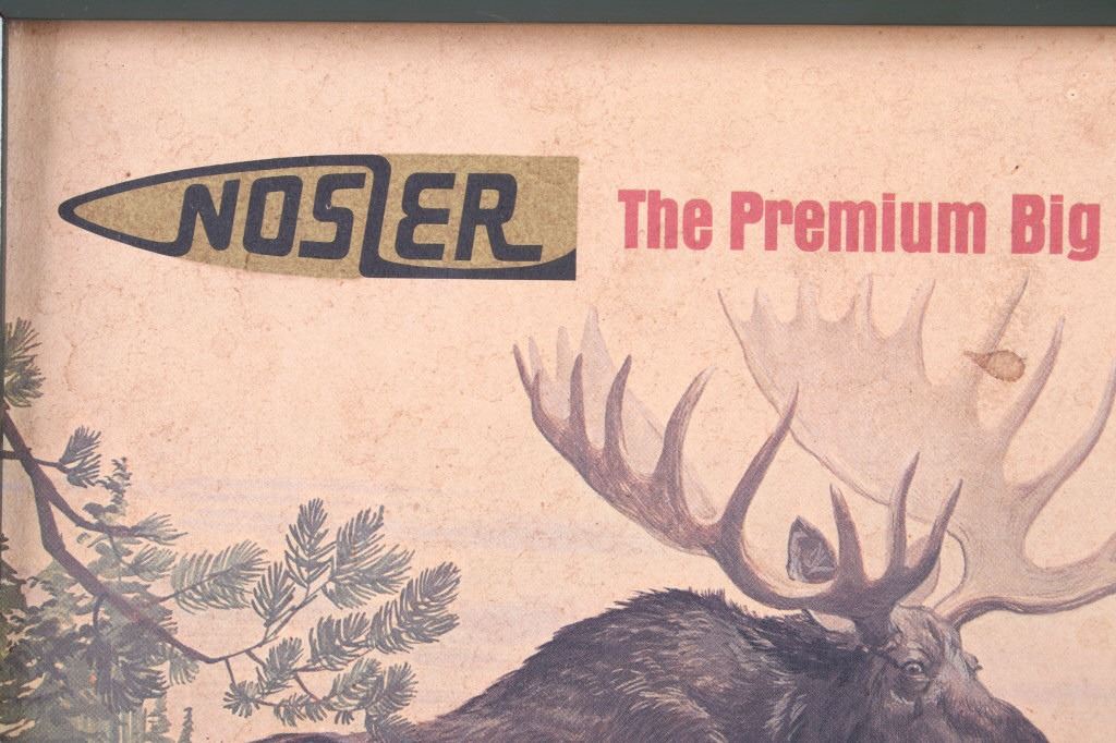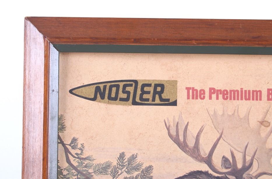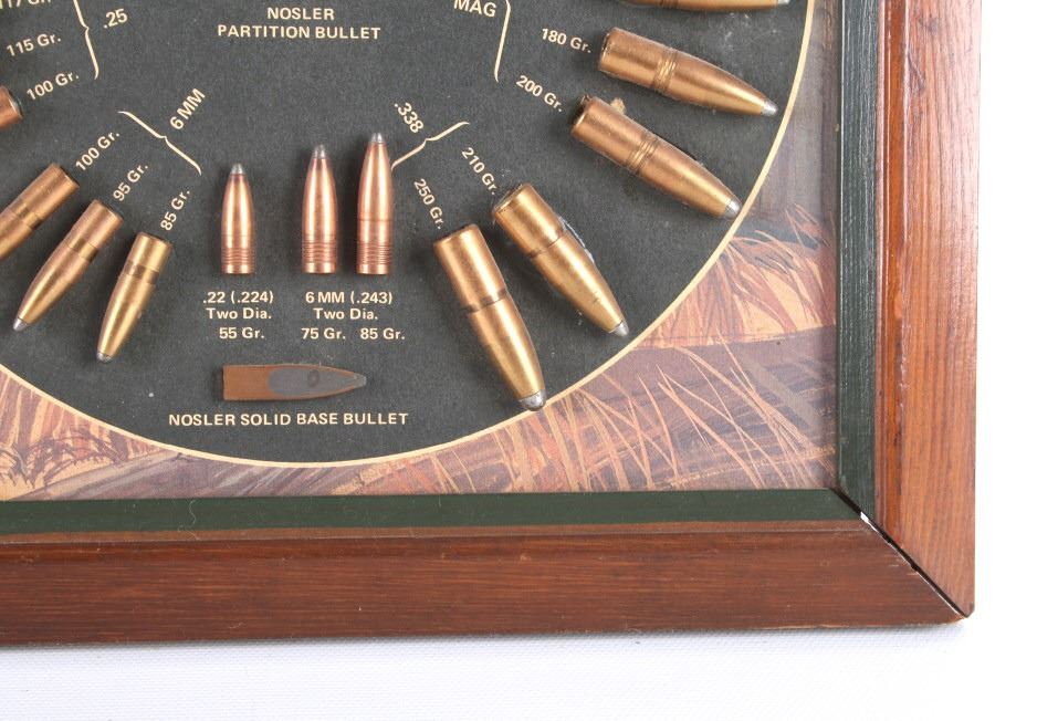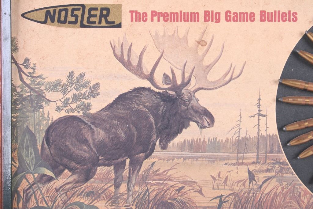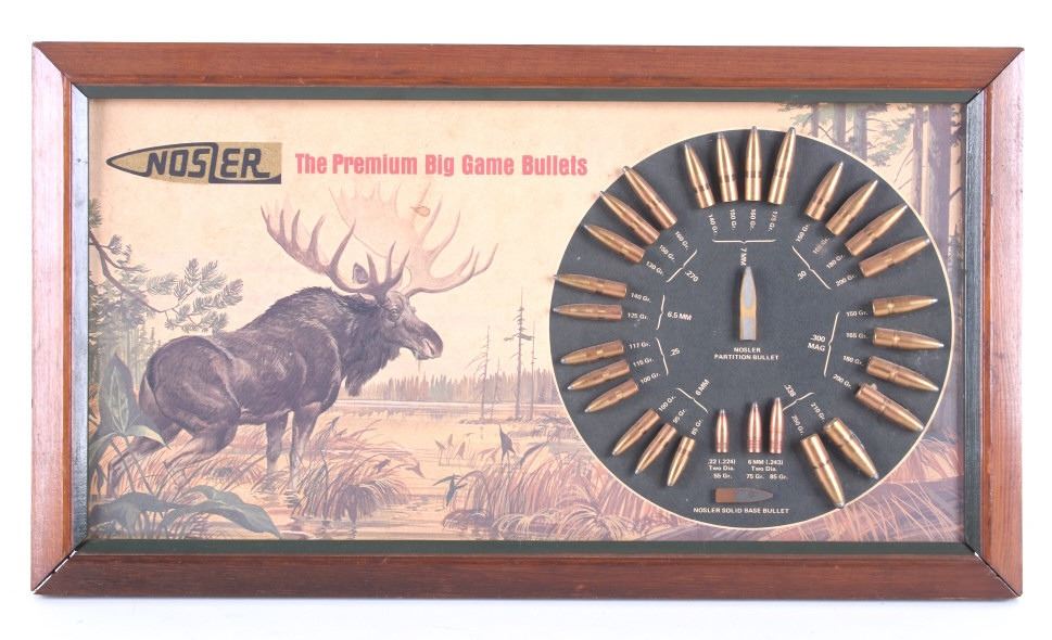 Featured in this lot is this Nosler "Premium Big Game Bullets" ordinance display advertisement founded 1948. The display shows a beautiful display of bullets with a picture of a bull moose. Founded in 1948 by John Amos Nosler. While hunting moose in British Columbia in 1946, the bullets he was using failed to penetrate deeply enough to reach vital organs and kill the animal quickly. The display shows twenty-eight bullets from .22- .338 250Gr, and two bullets cut in cross section. The condition of this ordinance display is fair with the board loose in the frame and light nicks from wear and age on the frame and a slightly separated corner. The measurements of the display in the frame are 17" x 9 1/2"