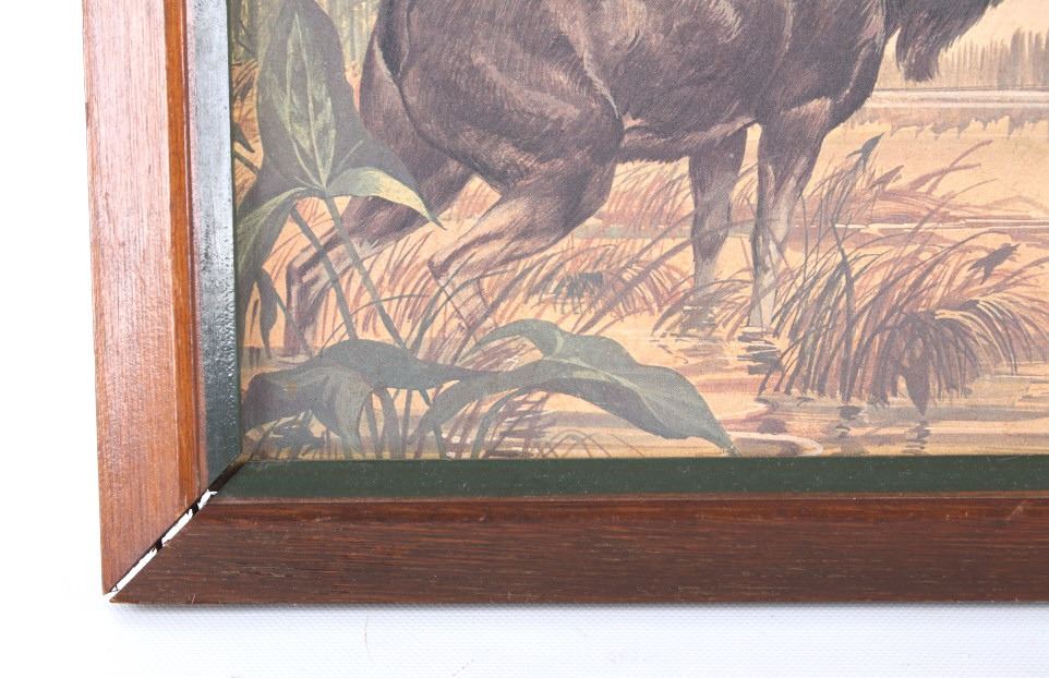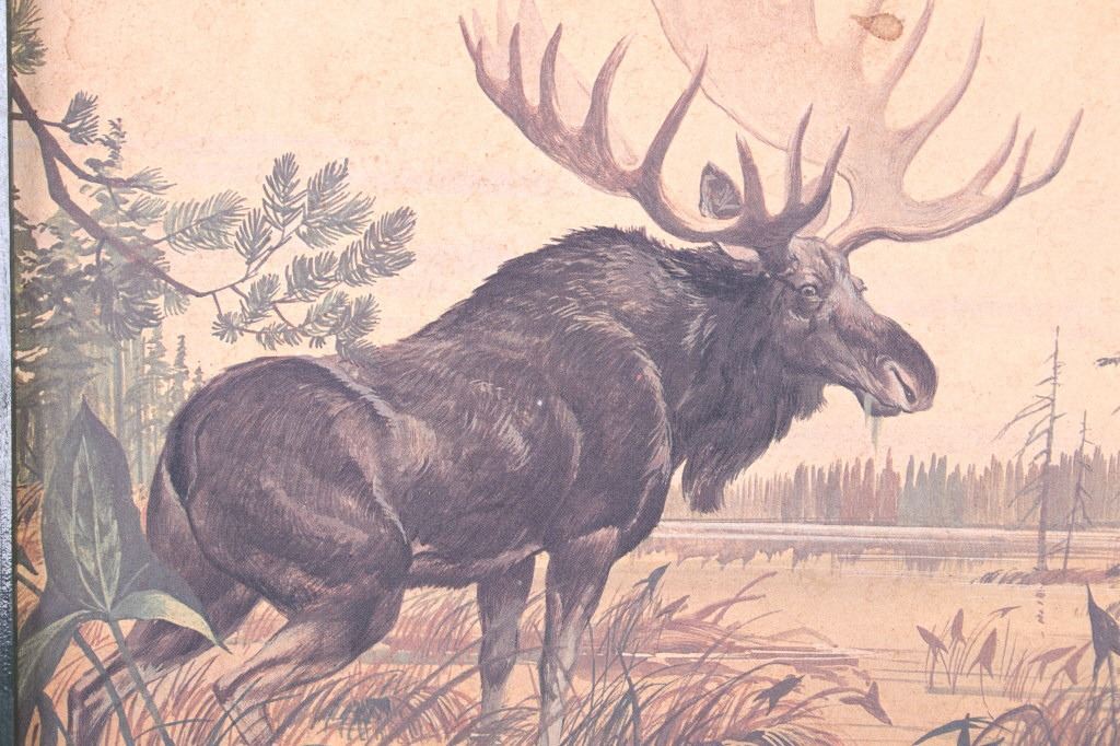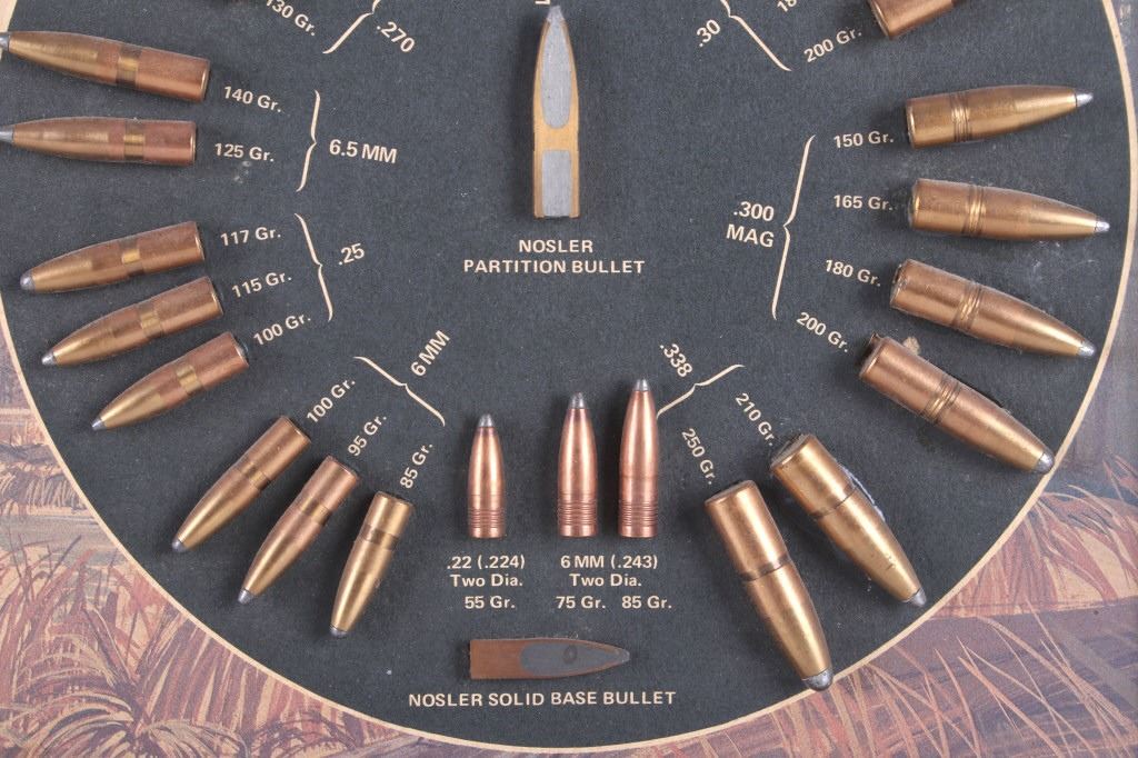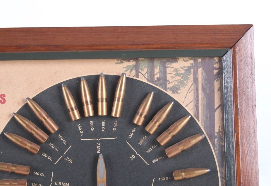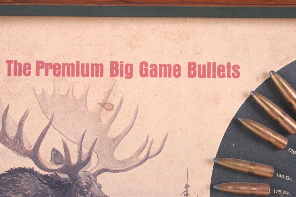 Featured in this lot is this Nosler "Premium Big Game Bullets" ordinance display advertisement founded 1948. The display shows a beautiful display of bullets with a picture of a bull moose. Founded in 1948 by John Amos Nosler. While hunting moose in British Columbia in 1946, the bullets he was using failed to penetrate deeply enough to reach vital organs and kill the animal quickly. The display shows twenty-eight bullets from .22- .338 250Gr, and two bullets cut in cross section. The condition of this ordinance display is fair with the board loose in the frame and light nicks from wear and age on the frame and a slightly separated corner. The measurements of the display in the frame are 17" x 9 1/2"