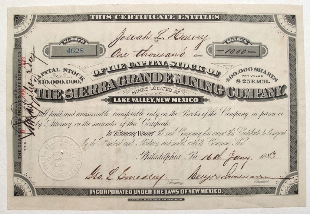 Cert. # 4628 for 1000 shares issued to Josiah L Carvey. Signed by Geo L Grendley & Buy H Houseamur.