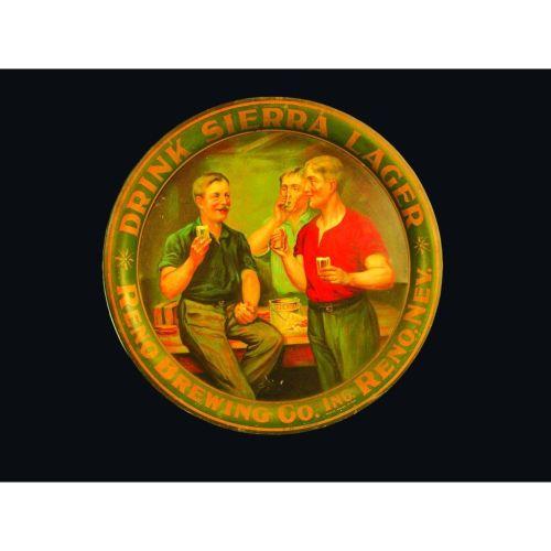 Sierra Lager Beer Tin Serving Tray, Reno Brewing Co., Reno, Nevada, some discoloration around the rim, otherwise very good condition, 13 1/4 inch diameter.
