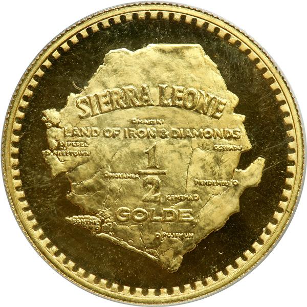 Sierra Leone. ½ Golde, 1966. Fr-2; KM-23a. Weight 0.8836 ounce. 5th Anniversary of Independence. Lion's head. Reverse: Map and value. PCGS graded Proof 65.