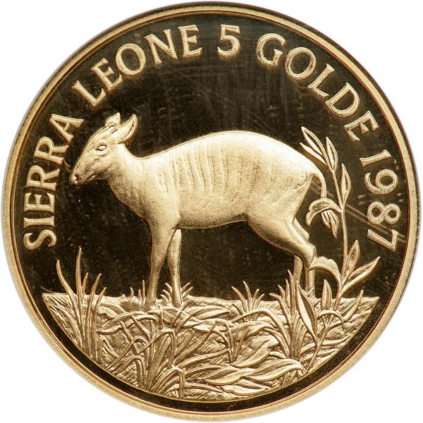 Sierra Leone. 5 Golde, 1987. Fr-12; KM-42. Weight 0.4716 ounce. Wolrld Wildlife Fund. Dr. Joseph Saidu Momoh. Reverse: Duiker Zebra. NGC graded Proof 69 Ultra Cameo.
