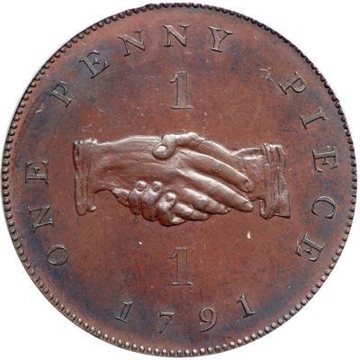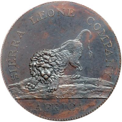 Sierra Leone. Proof Bronze Penny, 1791. KM-2.1. 32 mm. Lion, Africa below. Reverse: Clasped hands flanked by value, date below. PCGS graded Proof 64 Brown.