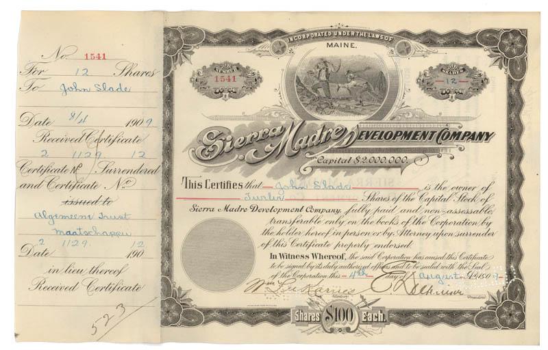 1909, Maine. Stock certificate for twelve shares. Black / White Vignette of two miners at top center. Blind embossed company seal. Perforation cancelled.