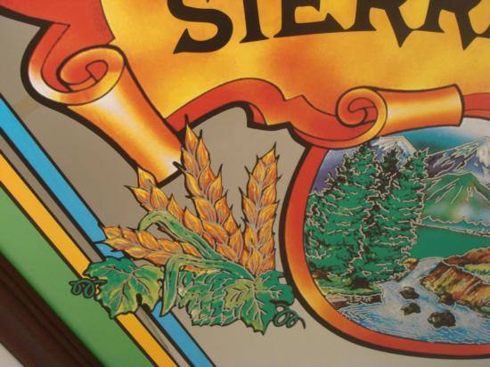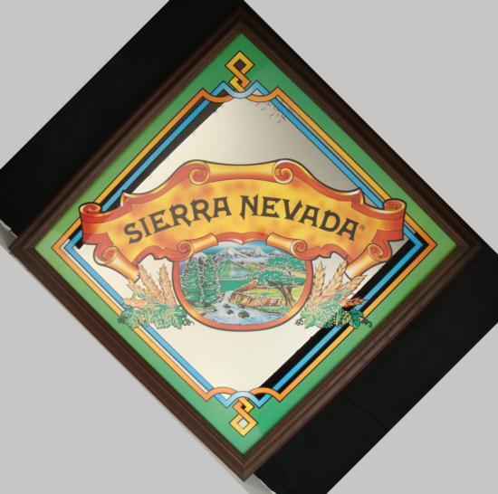 This Sierra Nevada mirror sign has a nicely detailed and colorful logo, with serene image of the Sierra Nevada mountains. It is in new condition. The dark wooden frame is 27" x 27".
