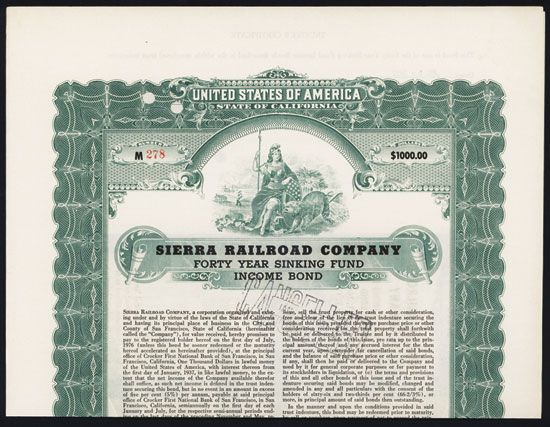 California, 1936, $1000, Sinking Fund Income Bond, Issued and Cancelled Bond, Black on green border and underprint, Vignette of lady liberty sitting with bear growling at her top center, VF-XF condition, The Major Knapp Eng. Mfg. & Lithography. Listed bond and railroad in Cox.