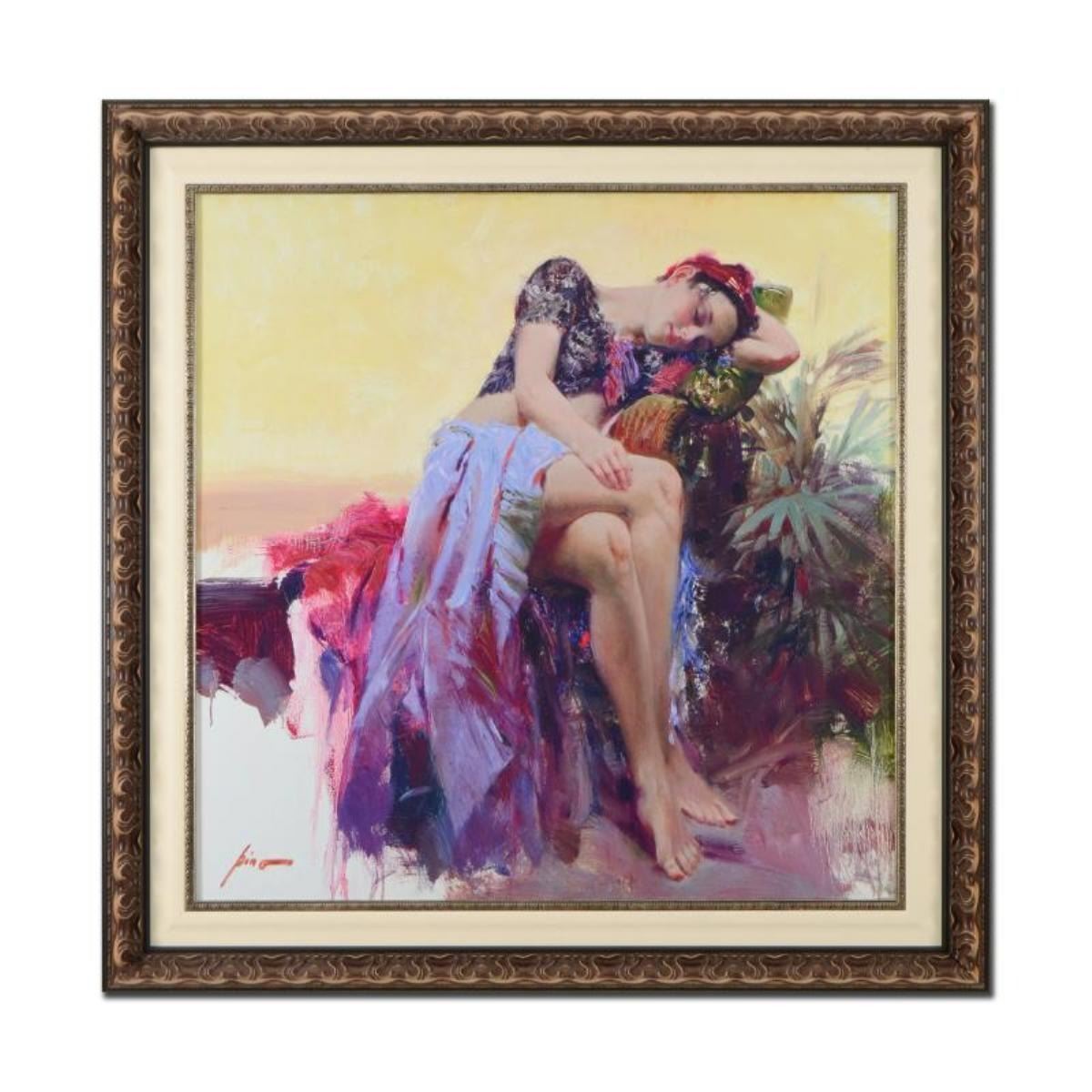 Pino's portraits allow glimpses into intensely personal, intimate spaces, conveying emotion through rich, warm color and sensual brushwork. "Siesta" is an artist-embellished limited edition giclee on canvas by Pino (1939-2010). The piece is numbered, hand signed, custom framed, and includes certificate of authenticity. Measures approx. 43.5" x 43.5" (frame), 34" x 34" (image).