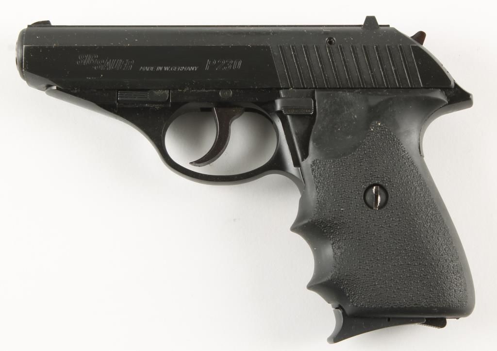 West German made double action semi auto pocket pistol with 3-5/8" barrel. Blued finish, pebbled finger groove Hogue grips, decocking lever and fixed sights. Very good bore and action. Includes original box, manual, original grips, and 5 magazines. Condition: Very good showing light use. *Modern Firearm*