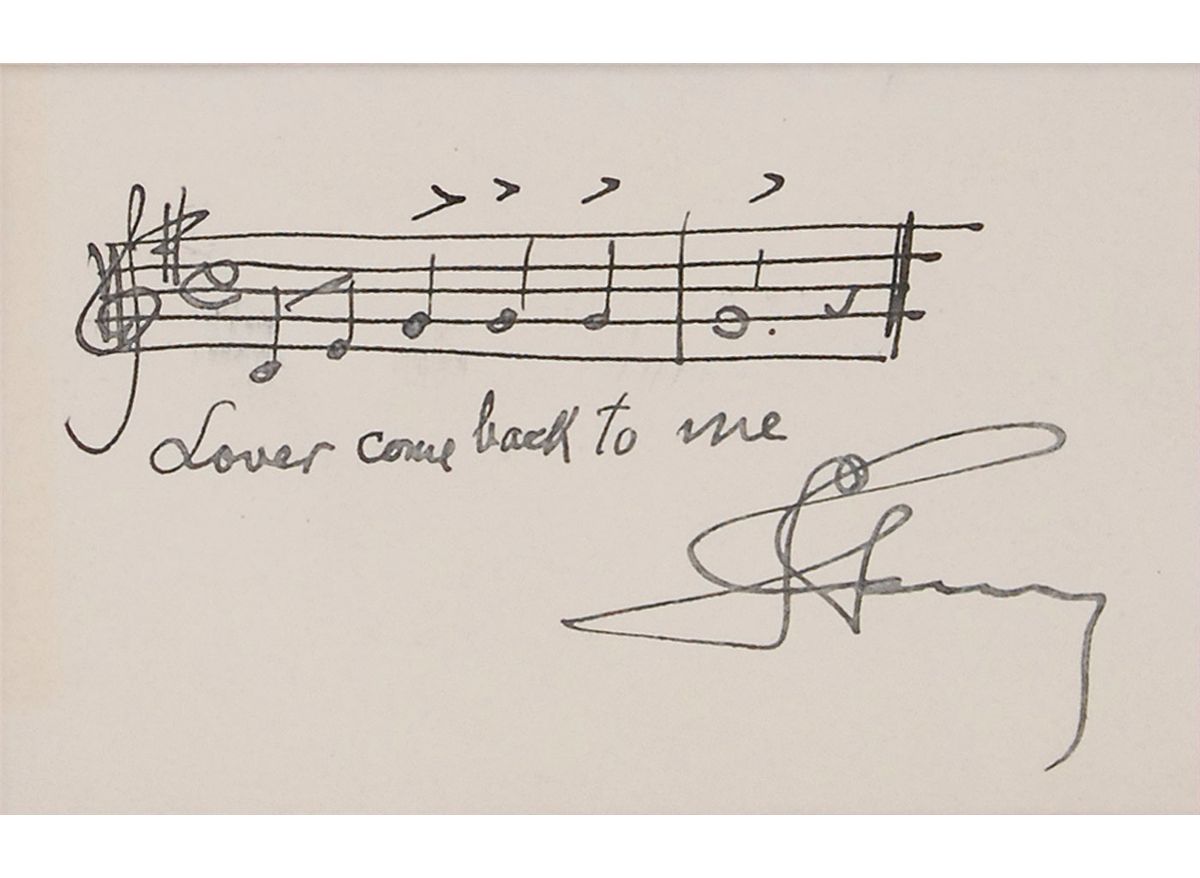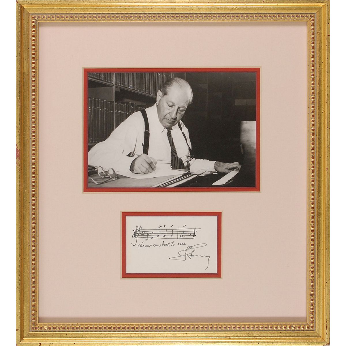 Choice AMQS on an off-white 3.75 x 2.25 card. Romberg pens two bars of music from the song “Lover Come Back to Me,” which he wrote for the Broadway show The New Moon. Double-matted and framed with a portrait to an overall size of 12.5 x 14. In fine condition.