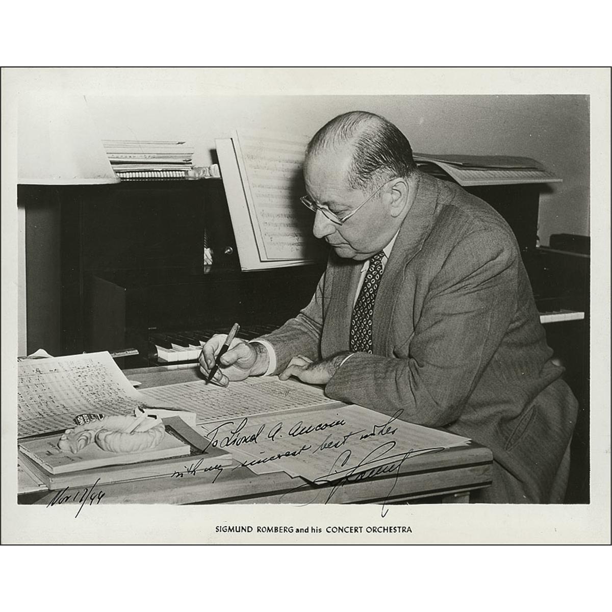 Prolific Hungarian-born composer. Vintage glossy 10 x 8 photo of Romberg pouring over pages of sheet music, signed and inscribed in fountain pen “To Lionel A. Aucoin, with my sincerest best wishes, Sig Romberg, Nov. 17/44.” In fine condition, with slight creasing along the left edge and faint scattered surface wear.