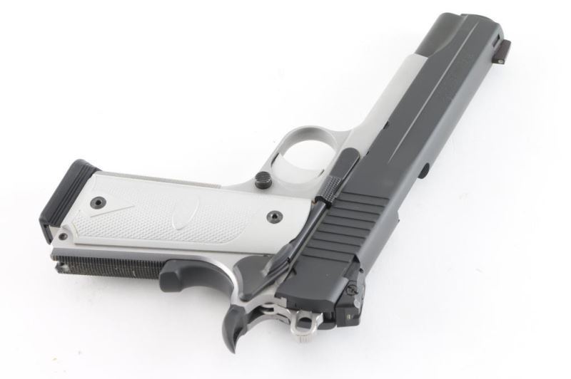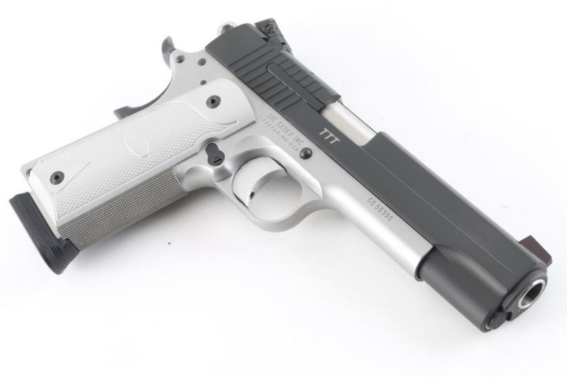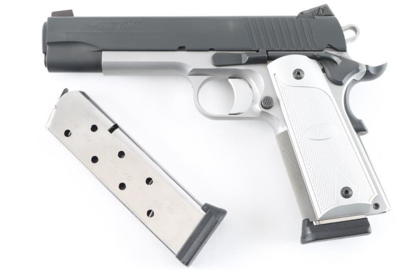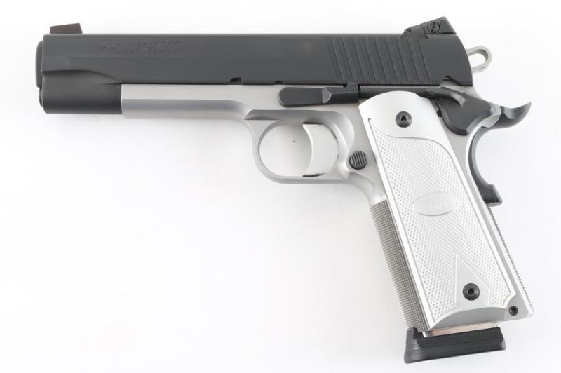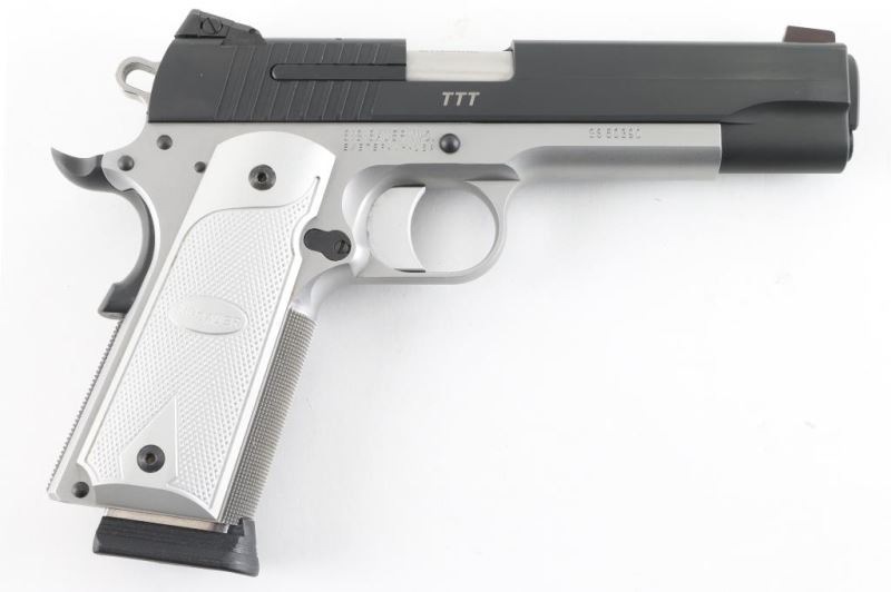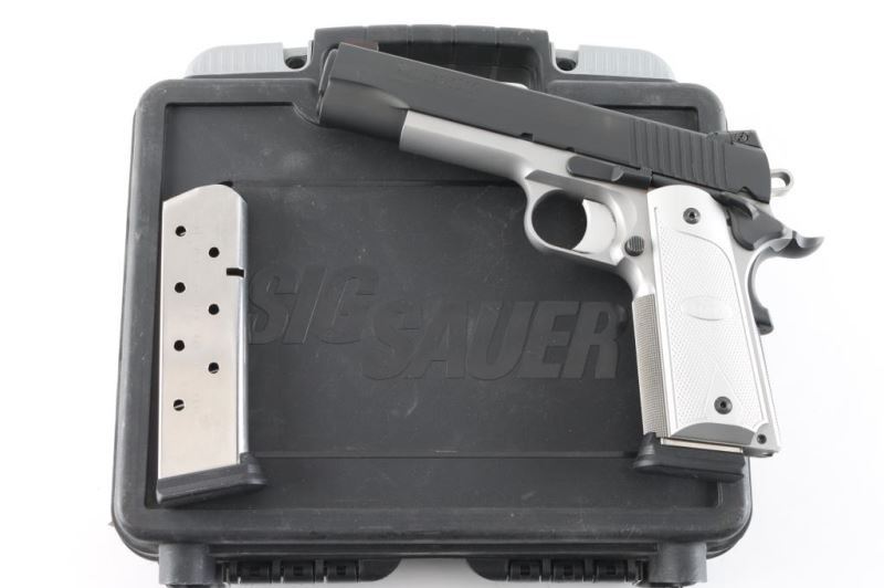 Two-tone stainless steel matte finish frame with a Nitron finished slide. single action semi-automatic pistol features: 5" barrel, adjustable combat sights, serrated trigger with overtravel adjustment, skeletonized hammer, manual safety on the left side of the frame, upswept grip safety with memory bump, push button magazine release, two 8 round magazines with finger rest floorplates, checkered flat mainspring housing, checkered alloy "Sig Sauer" grips. The TTT model has the traditional lines of the 1911but includes enhanced safety features such as a firing pin safety and hammer intercept notch. beveled magazine well. Condition is like new with few signs of handling. Bore is excellent. Includes factory hard case , does not have the foam liners. C