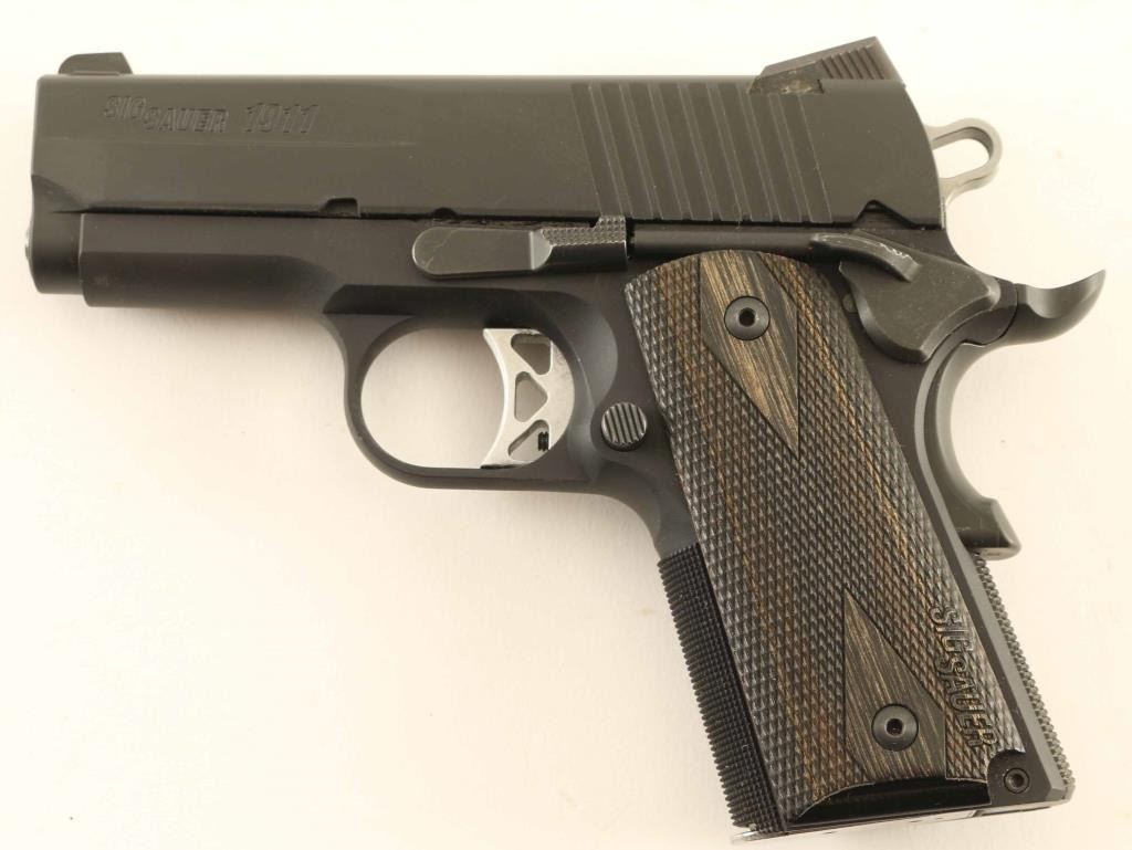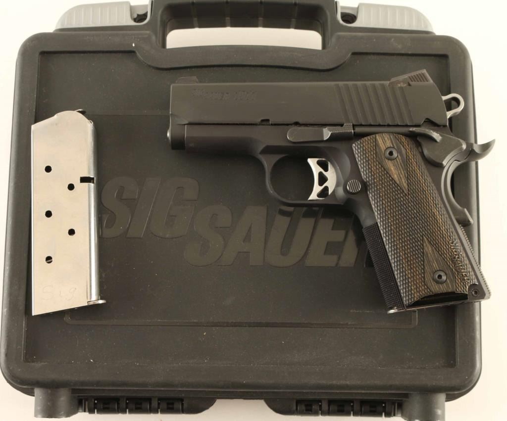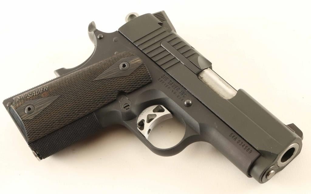 American made single action semi-automatic compact pistol chambered in .45 Auto, manufactured circa 2013. Features a black Nitron finished stainless steel slide, match grade 3.3" bushingless barrel, full-length steel guide rod, dovetailed three-dot low profile SigLite night sights, serrated "k" trigger with overtravel adjustment, skeletonized hammer, thumb safety on the left side of the frame, upswept grip safety with memory bump, push button magazine release, 7 round magazine, aluminum-alloy frame with knurled front strap & beveled magazine well, knurled flat mainspring housing and two-piece double diamond checkered Hogue Blackwood laminated wood grips with Sig Sauer decor. Includes the original factor hard case with manual, lock and spare magazine. Pistol exhibits approximately 97% of it's original finish showing slide wear on the barrel, dings on the side of the sights from drifting with a punch and few minor handling marks. Action is smooth, the bore is pristine and wood grips are fine. Condition is near NRA Excellent in case. ***Modern Firearm***
