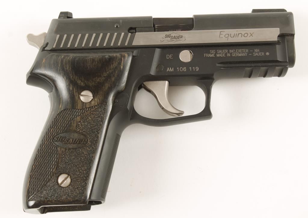 Double action semi auto "Equinox" pistol with 3-3/4" barrel. Blackened steel slide, alloy frame, checkered/pebbled laminated wood print plastic grips, decocking lever and 3-dot sights. Very good bore and action. No magazine. Condition: Very good showing light use. *Modern Firearm*