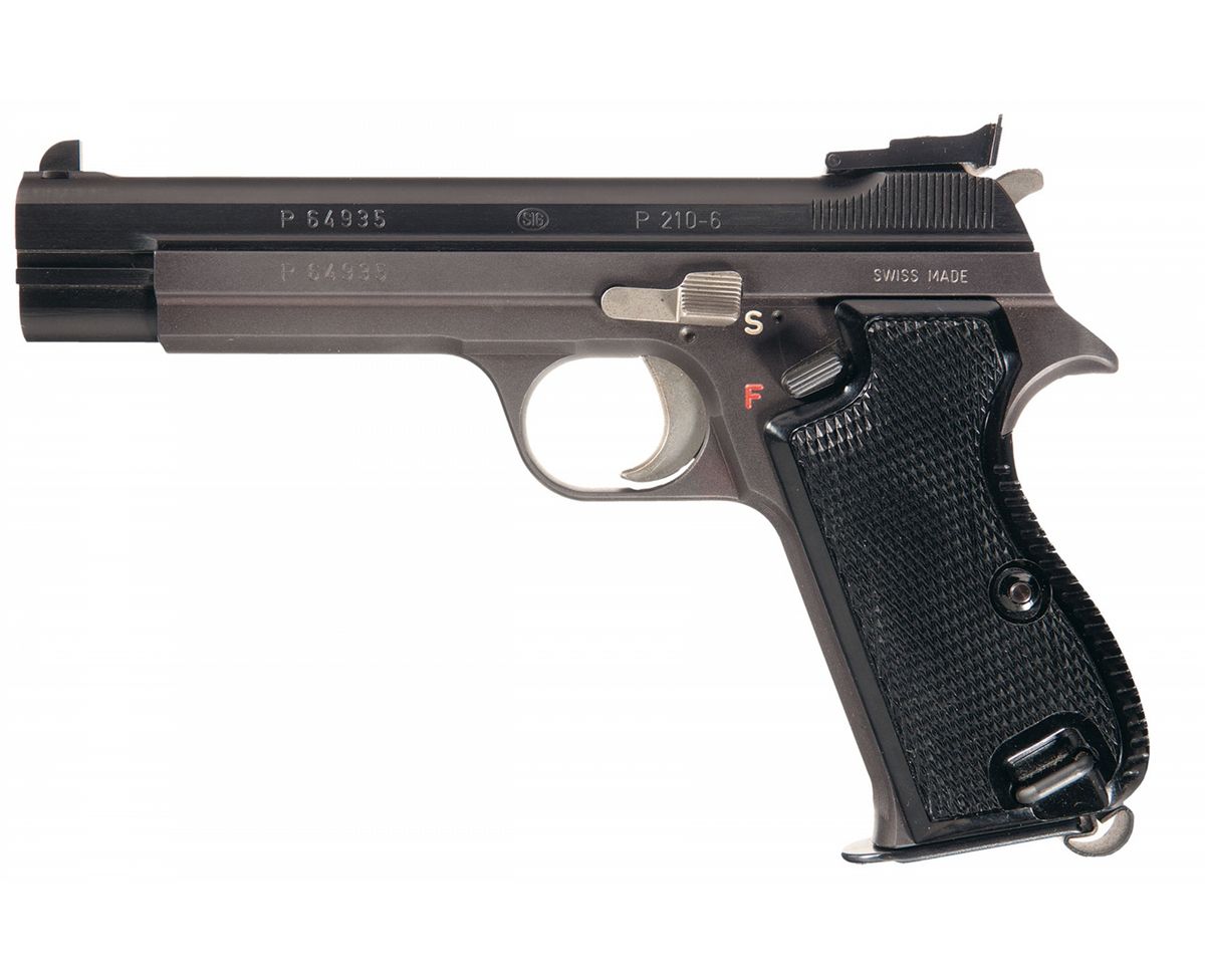 Adjustable notch rear sight with matching numbers on frame, slide and barrel. "SWISS MADE" is inscribed on the left frame side and "Benet Arms S.F. Cal. 94-4097" on right. Serrated hammer, smooth trigger and checkered wraparound grips. With manual.