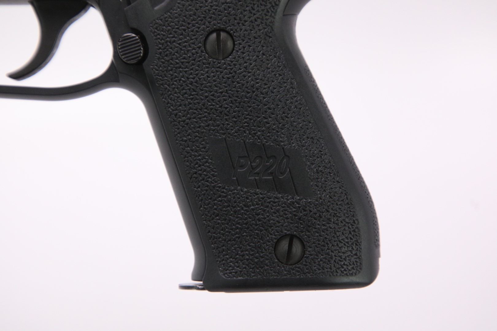 Grip Configuration & Condition: The grips are two-piece black synthetic with Sig Sauer marking on the right and P220 on the left. There is no notable wear or damage, just some light handling marks. The grips are in excellent overall condition.