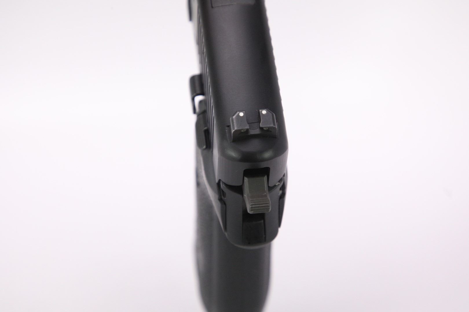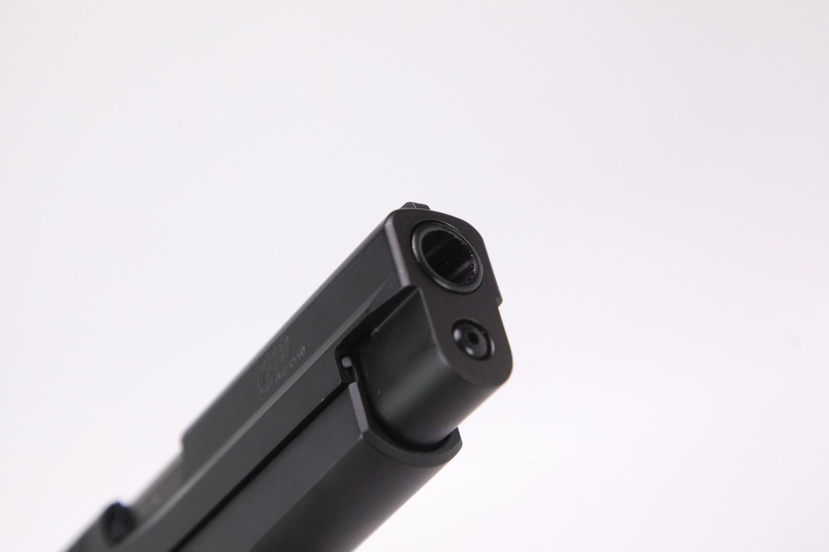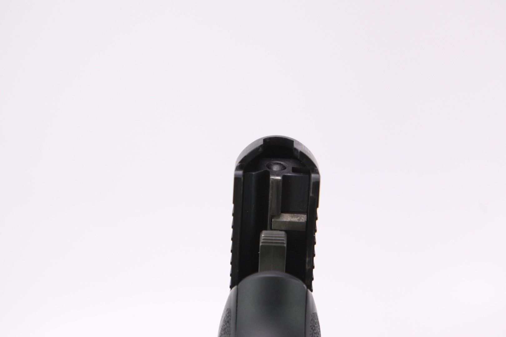 Sights / Optics: The front sight is a blade with a tritium insert dovetailed to the slide above the muzzle. The rear sight is a square notch with flanking tritium inserts dovetailed to the top rear of the slide. The tritium inserts are very dim and in need of replacement.