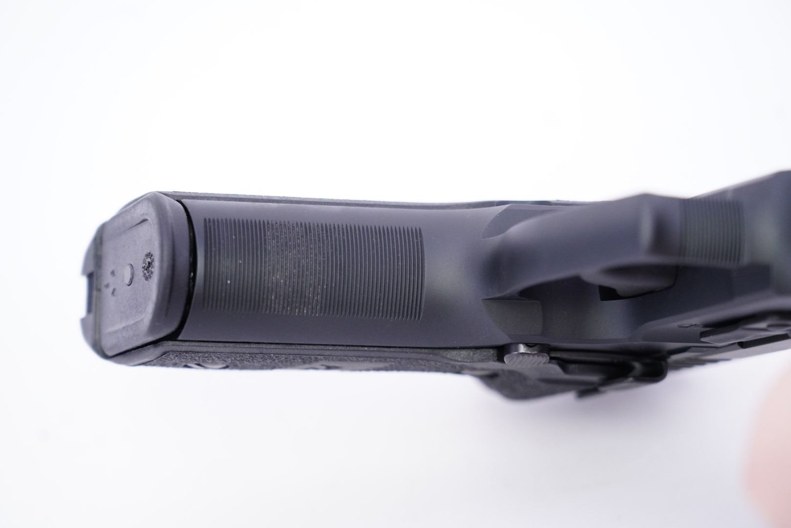 Stock Configuration & Condition: . The grips are two piece black textured synthetic pannels that wrap around the backstrap. The grps show light handling and storage marks. There are no chips or cracks present. The grips rate in about excellent overall condition.