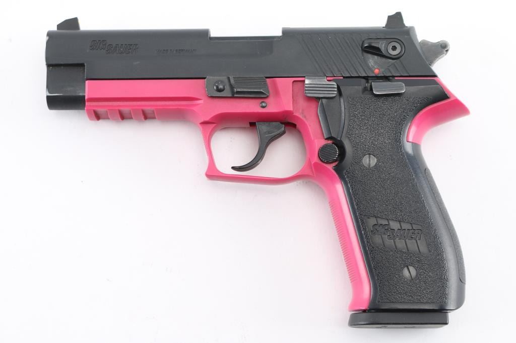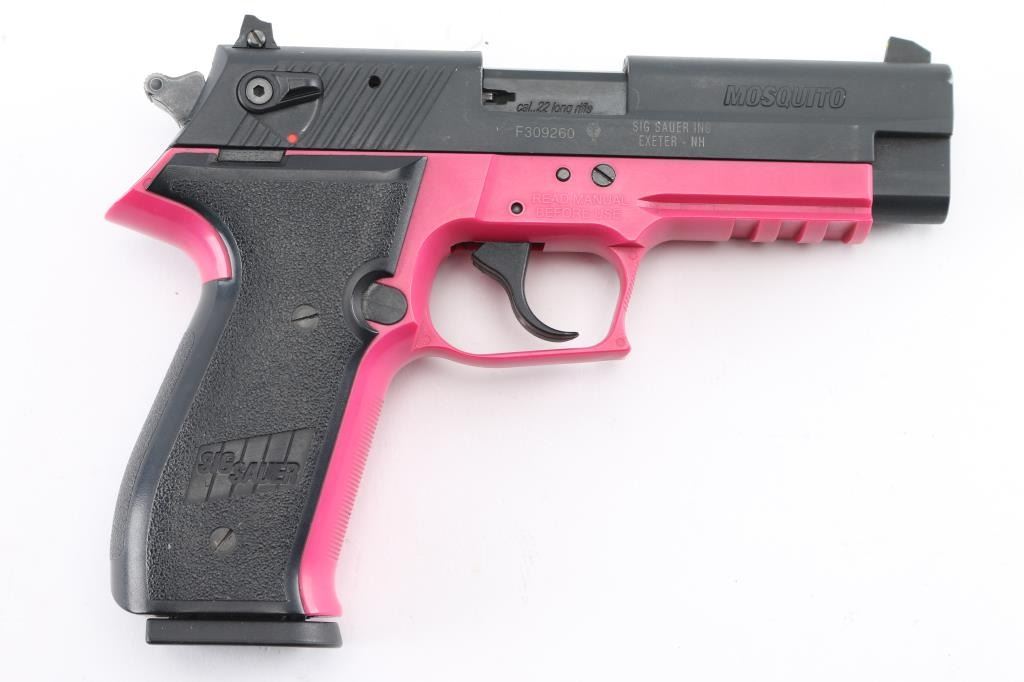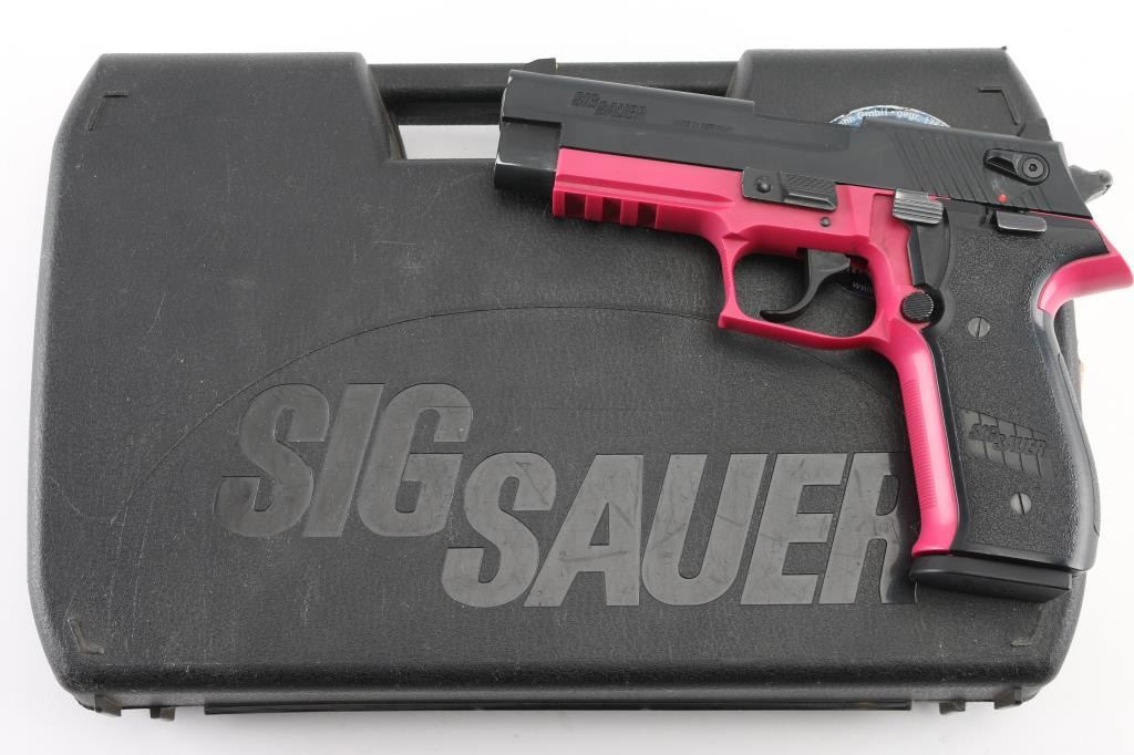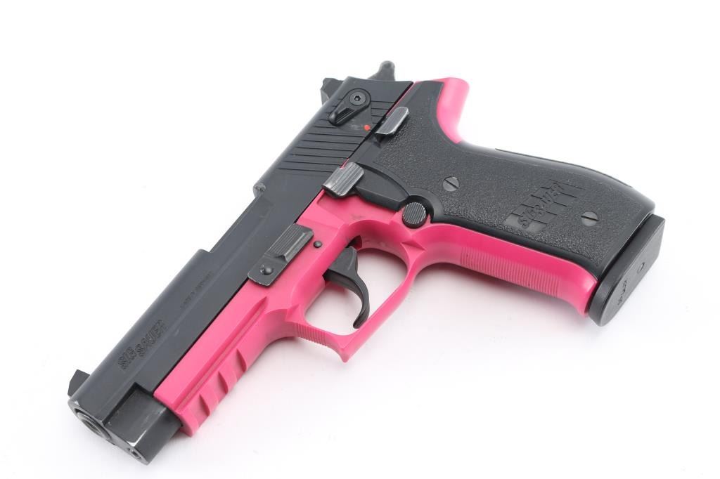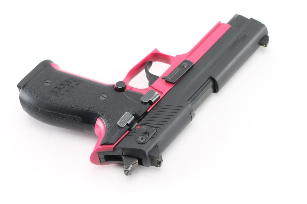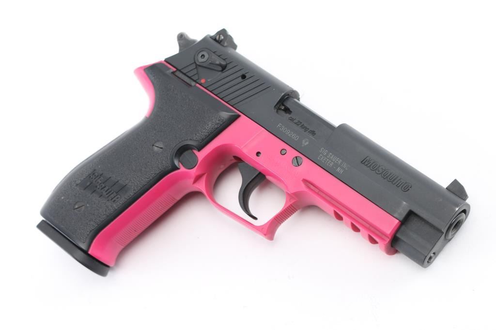 German made double action semi-automatic pistol chambered in .22 Long Rifle. Imported by Sig Sauer, Exeter, NH. Features a matte off-black finished slide, 3.9" barrel, three-dot high contrast sights with drift adjustable rear, ambidextrous thumb safety, smooth trigger, serrated round hammer spur, thumb decocker, push button magazine release, 10 round magazine, pink polymer frame with integral accessory rail and Sig two-piece textured black synthetic wrap-around grips. Includes the original factory hard case. Pistol exhibits approximately 98% of it's original finish showing a couple scuffs to the matte finished slide with no other wear observed. Action is smooth, bore is excellent and polymer is fine. Condition is NRA Very Good. Modern firearm.