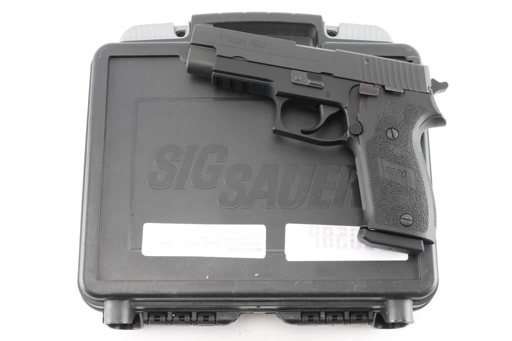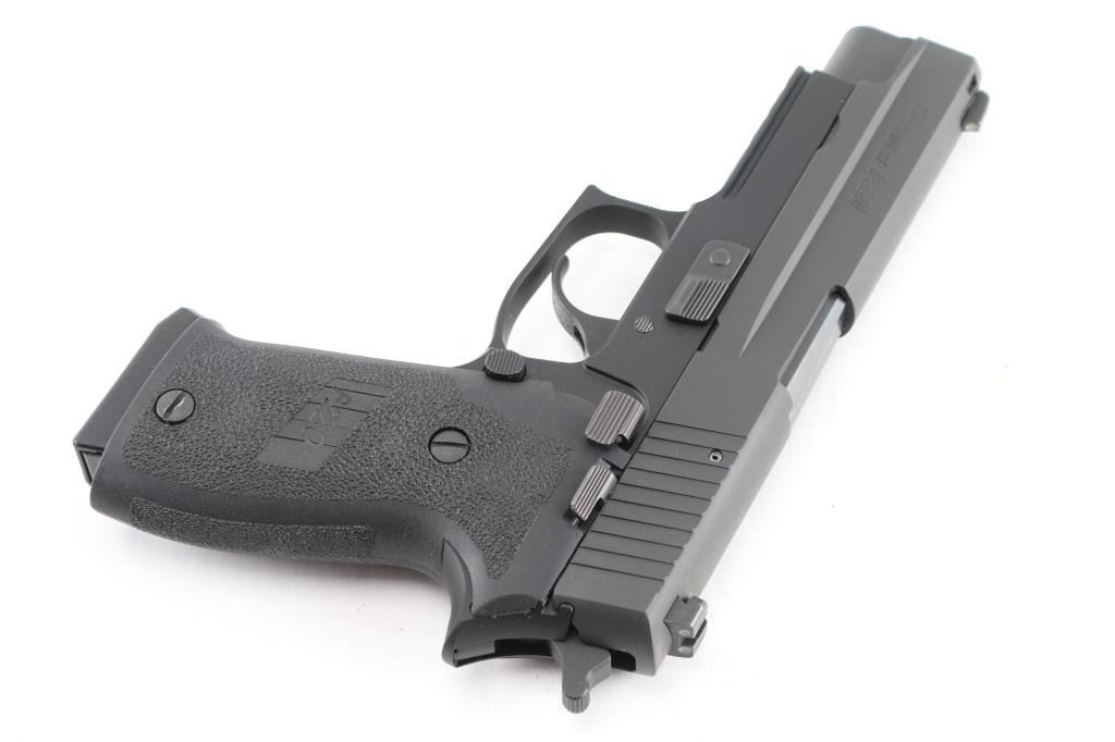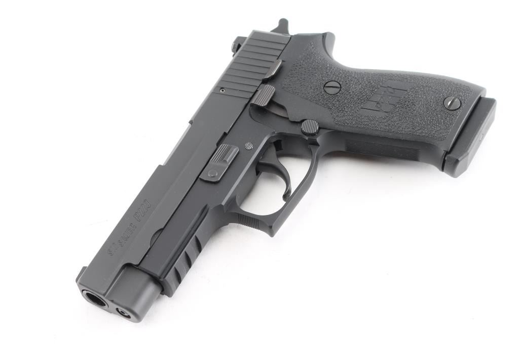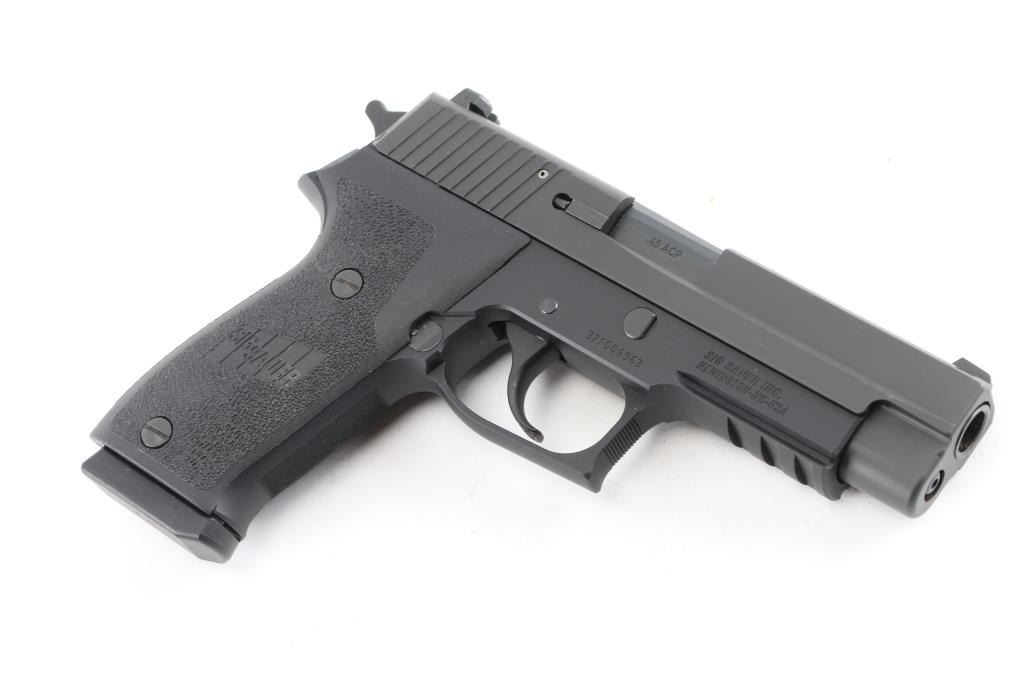 Desirable DA/SA semi-automatic full-size pistol chambered in .45 Auto, manufactured in Germany and imported by Sigarms Inc. of Newington, NH with import stamp on the left side of the slide. Features a matte black finished slide, 4.25" barrel, full-length steel guide rod, dovetailed blade front sight with white dot, dovetailed rear sight with square notch with two white dots, smooth trigger, serrated round hammer spur, thumb decocking lever on the left side of the frame, push button magazine release, black hard coat anodized alloy frame and textured black synthetic wrap-around grips. Comes with one 8 round factory magazine. Bore is pristine. Frame and grip looks great. Gun looks like new.