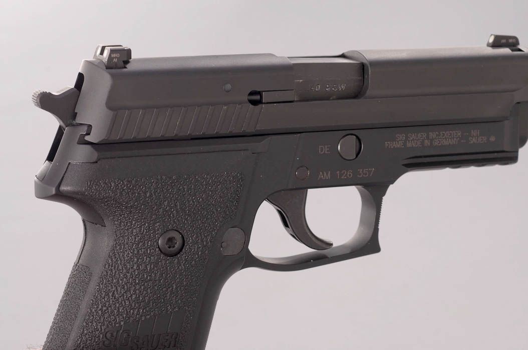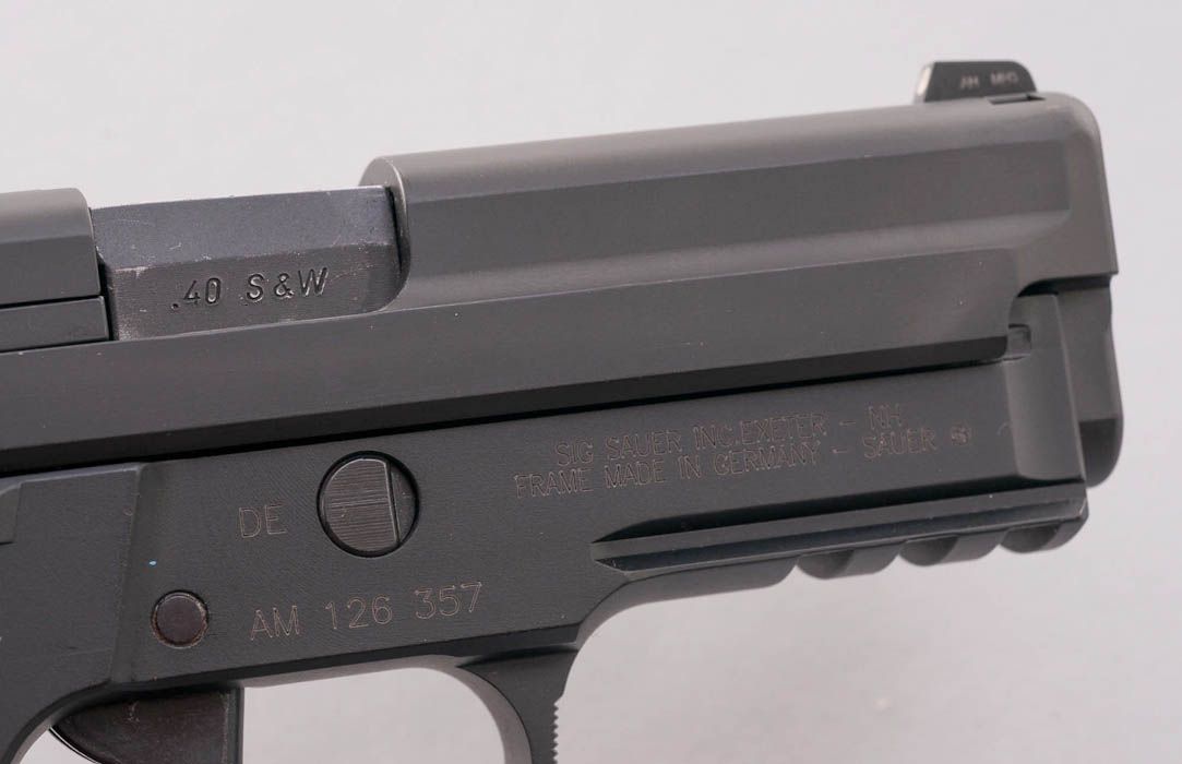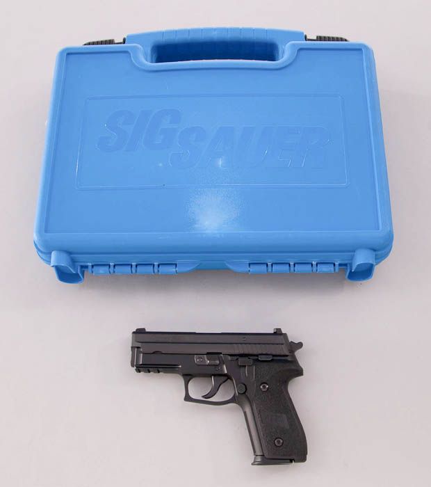 Sig Sauer P229 Semi-Automatic Pistol, #AM126357, .40 S&W cal., 3-1/2'' barrel, matte finish, factory pebbled grain black plastic wraparound grips, with ten-round magazines and one trigger lock, in factory blue hard case. Condition is excellent, appearing new and unfired. Est.: $500-$750. (Modern)