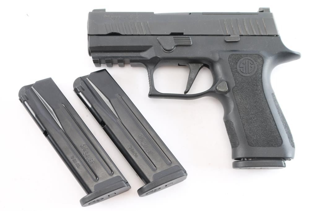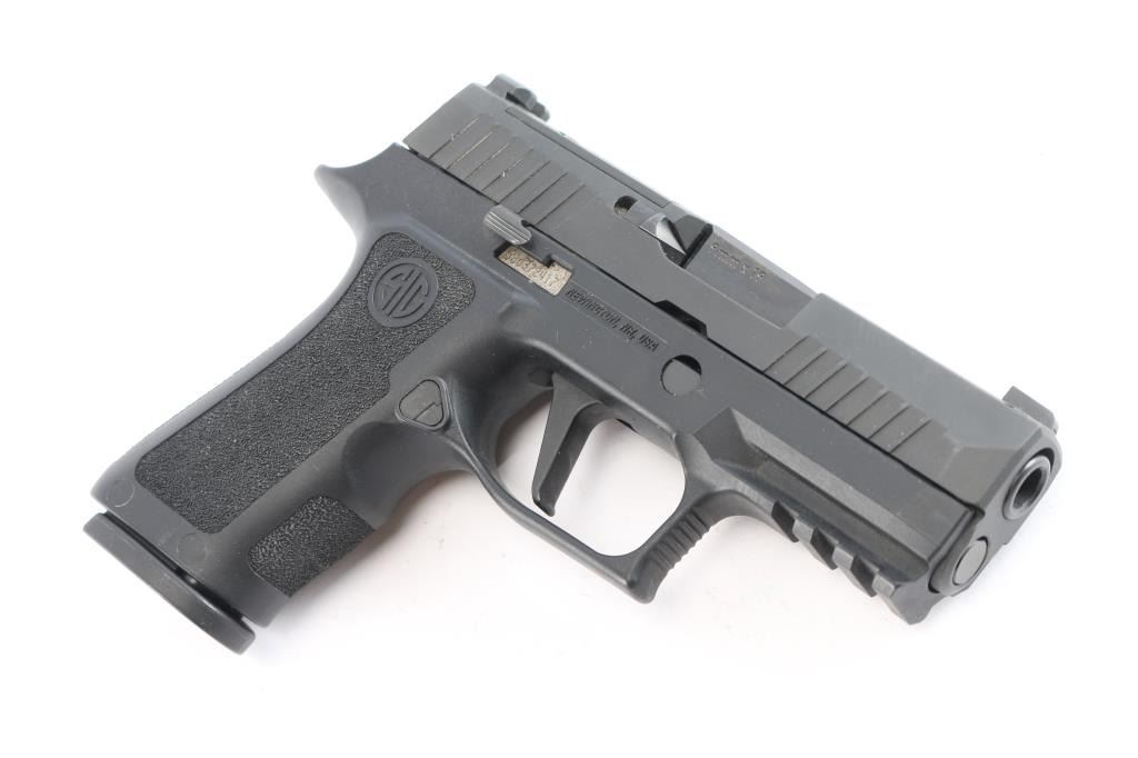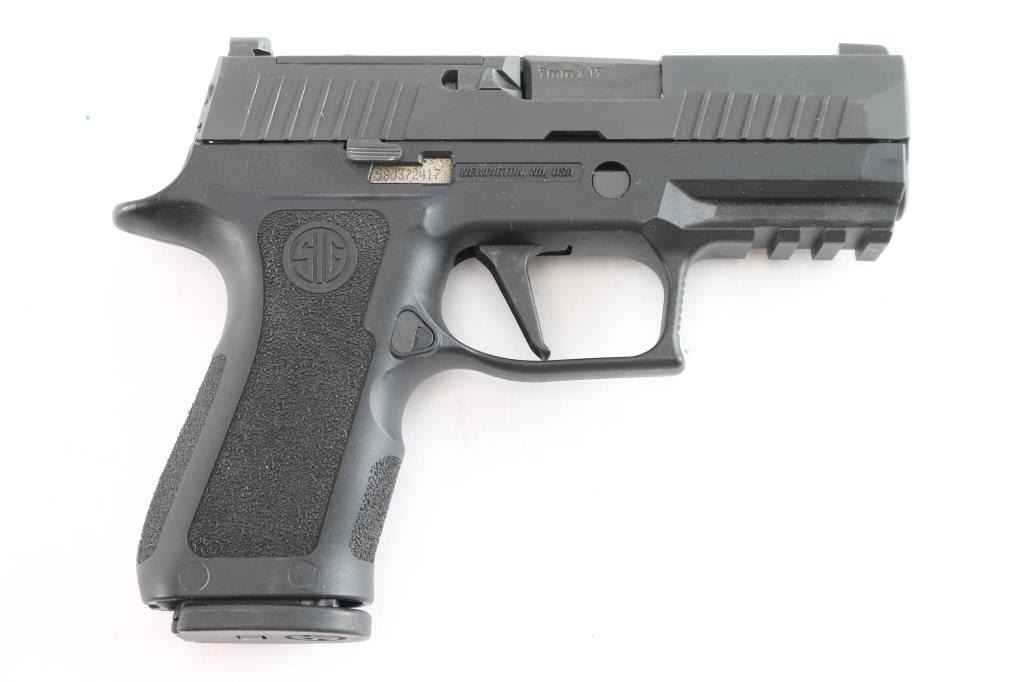 American made semi-automatic striker-fired 'X-Series' compact pistol chambered for 9x19mm Luger, manufactured circa 2022 in Newington, NH. Pistol features a matte black Nitron finish, 3.6" barrel, front and rear slide serrations, dovetailed XRay3 day and night sights, metal guide rod assembly with dual recoil springs, serrated push-button magazine release, under-cut trigger guard, extended beavertail, smooth straight-faced trigger, fifteen-round magazines, flared magazine well, accessory rail on dust cover, and stippled black polymer grip module with finger groove and Sig insignias. Pistol retains approximately 99% of its original matte black Nitron finish with superficial scratches. Metal displays no rust or deformation. The action is smooth and crisp. The bore is bright with strong rifling. The polymer grip module is also excellent with a light blemish on the trigger guard and the accessory rail. Pistol includes the original factory foam lined hard case with matching end label, three OEM magazines total, sticker, owner's manual, and lock.