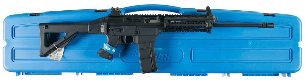 Introduced in 2006. Blade hooded front sight with a rail-mounted Sig adjustable drum notch/peep sight mounted over a flip-up backup sight, birdcage flash hider, Sig-Sauer branded quad-rail forearm, ribbed pistol grip and folding 3-position telescoping buttstock. With factory case numbered to gun, three Sig Sauer ergo rail forearm grip panels, extra recoil pad, sight tool, lock and papers.