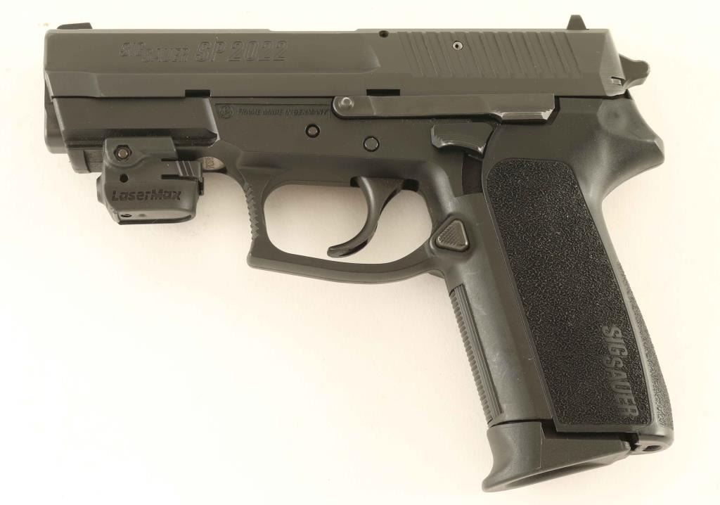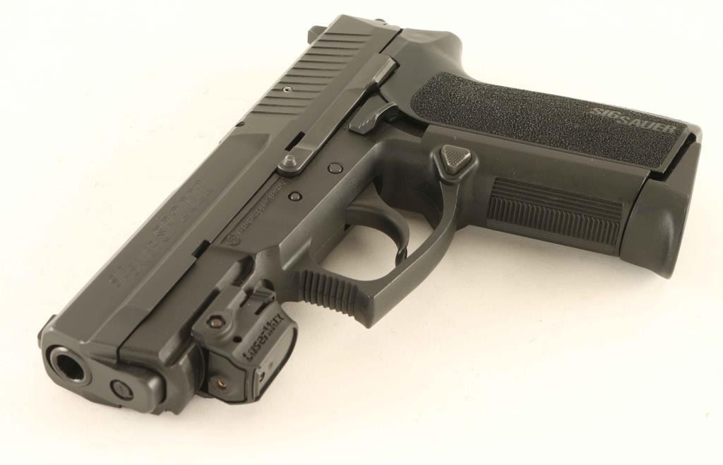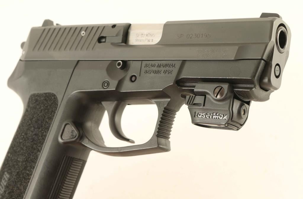 Full size double action semi-automatic pistol chambered in 9x19mm, produced in American with some German made parts. Features a black Nitron finished stainless steel slide, German made 3.8" barrel, dovetailed white dot front sight, dovetailed square notched rear sight with white bar, smooth trigger, serrated round hammer spur, thumb decocker on the left side of the fame, push button magazine release, factory 15 round magazine, German made black polymer frame with integral accessory rail, LaserMax laser, and one-piece stippled black synthetic E2 wrap-around grip. Includes the original factory hard case with manual, cleaning rod, brush and hang tag. Pistol exhibits approximately 98% of it's original finish showing slide wear on the barrel and a single fine scratch on the top of the slide. Action is smooth, the bore is pristine and polymer is fine with minor scuffs. Condition is near NRA Excellent in case. ***Modern Firearm***