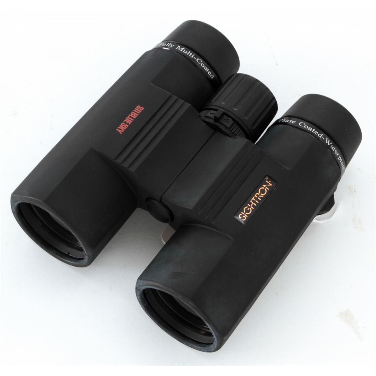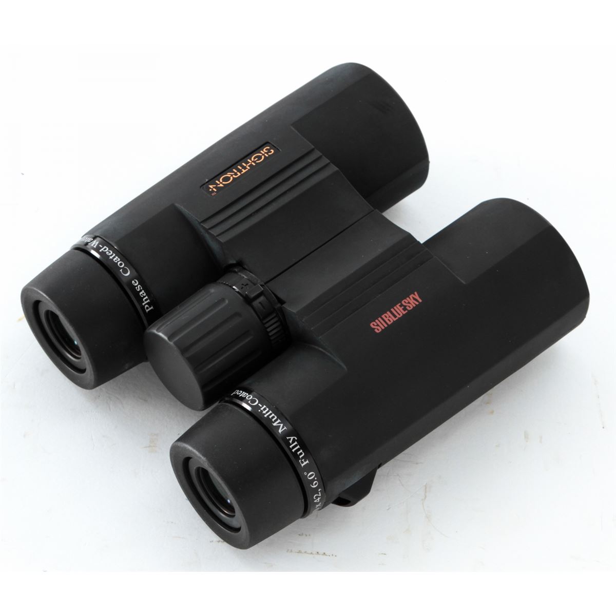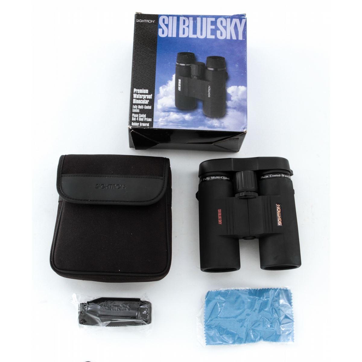 Sightron SII Blue Sky Premium Waterproof Binoculars, 10x42mm, black rubber armored, phase coated Bak-4 roof prisms, fully-multi-coated lens. Brand new in original box with case, neck strap and instructions. Box shows scuffs and scrapes. Retails @ $320.95. Est.: $150-$250. (Field Time)
