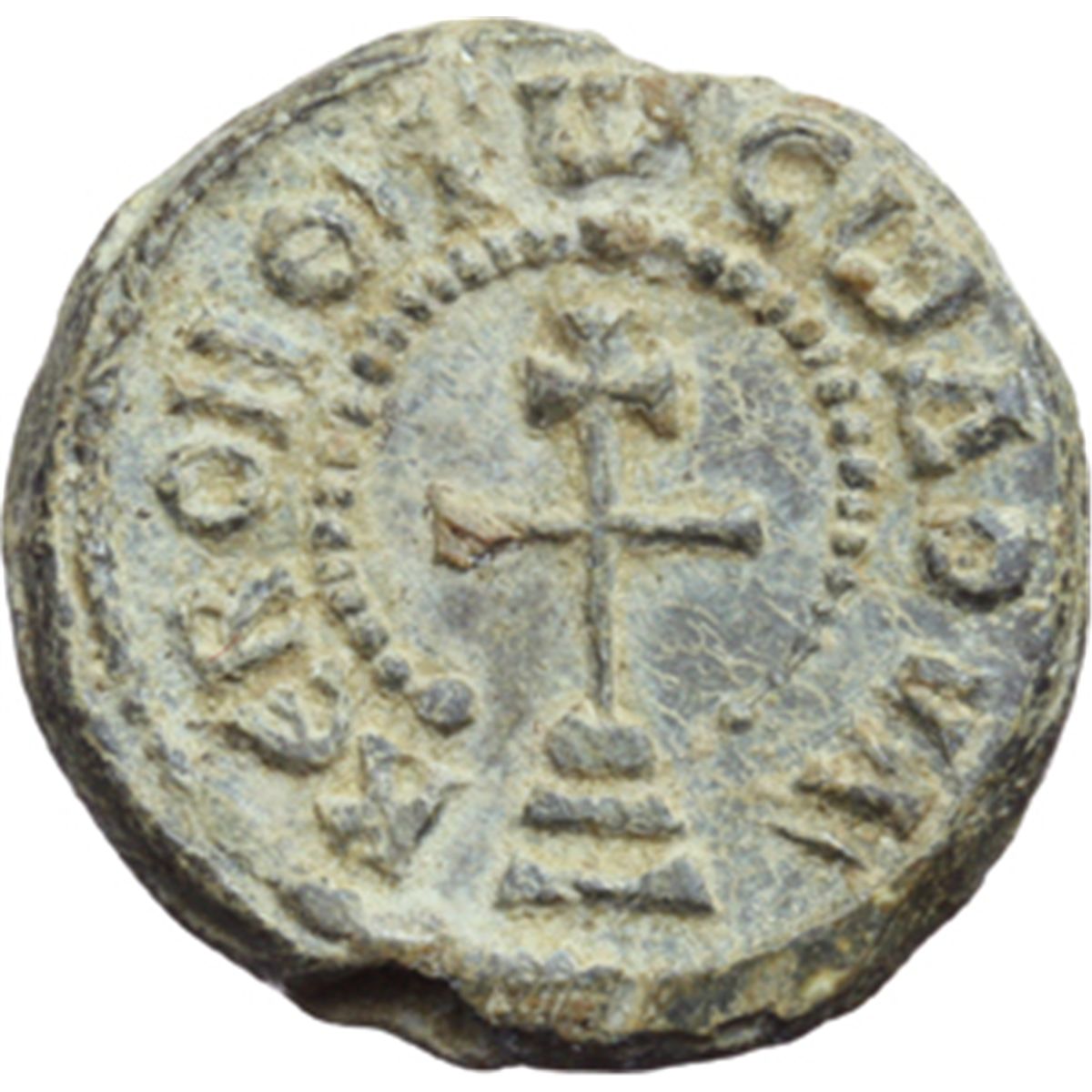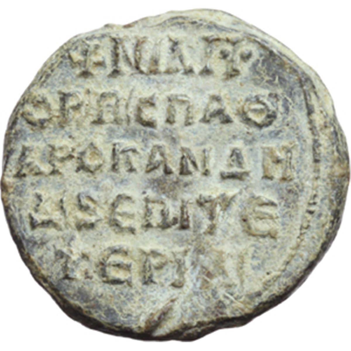 Impero Bizantino. Sigillo, VIII-X secolo d.C. D/ Croce ricrociata su tre gradini. Nel giro, entro doppio cerchio perlinato, KE BOHŒò Tœâ cœâ ŒîOYŒõ. R/ +NIKE+/OP...CŒ†AŒò/APOKANŒîŒù/ŒîISEŒ†ITE/TEPI... PB. g. 4.61 mm. 17.00 R. Molto raro e di qualitv† eccezionale. SPL.