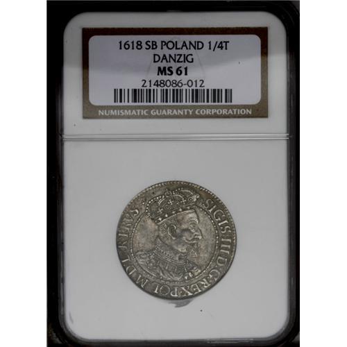 <B>Sigismund III. Danzig trio of NGC certified 1/4 Talers; </B></I>1618SA Kop. 7494 R1, KM14, MS61 with light orginal toning. There is a trace of a micro date on the reverse(it is incorrectly described on the holder as the SB variety); 1623 Kop. 7504 R, KM15.2, AU50. It is a lightly toned, boldly struck, problem free coin; and a 1625 Kop. 7506 R, KM15.2, AU50, bold strike.