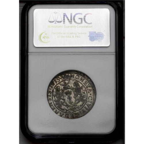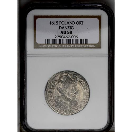 <B>Sigismund III. Danzig two varieties of 1/4 Taler 1615: </B></I>Kop. 7489 R1, KM6, AU58 NGC, with light rubbing on the high points and is attractive. The coin has a slight mint edge clip. This is the variety with a micro date; Kop. 7488 R2, KM6, AU55 NGC, with light toning. This variety has a small SA on the reverse.