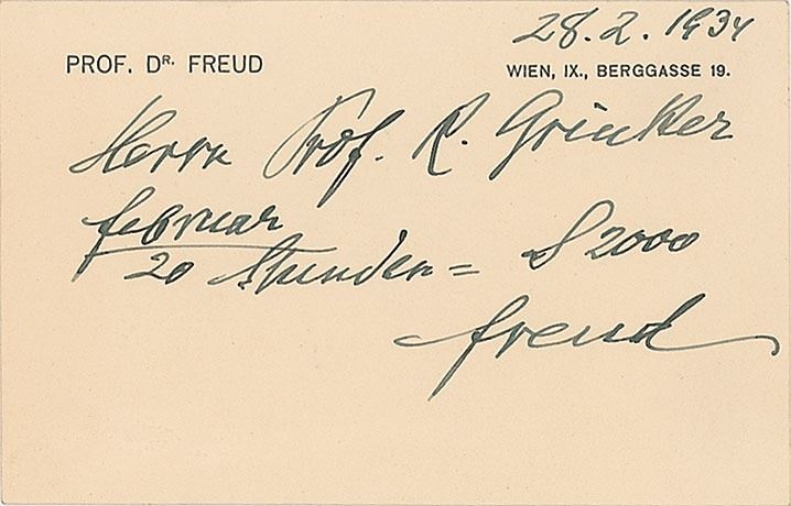 ADS in German, signed "Freud," one page on a 5.25 x 3.5 personal card, February 28, 1934. An invoice for 2000 Austrian shillings' worth of training services for the month, in full: "Herrn Prof R. Grinker, February/20 hours = S2000." In fine condition, with some old mounting remnants on the reverse. Dr. Roy R. Grinker, Sr., was a pioneer in American psychiatry who sought training from Freud in Vienna in 1933–34. He went on to serve as professor of psychiatry at the University of Illinois College of Medicine, Northwestern University, and the University of Chicago School of Medicine, as well as chief editor of the American Medical Association's Archives of General Psychiatry for 17 years.