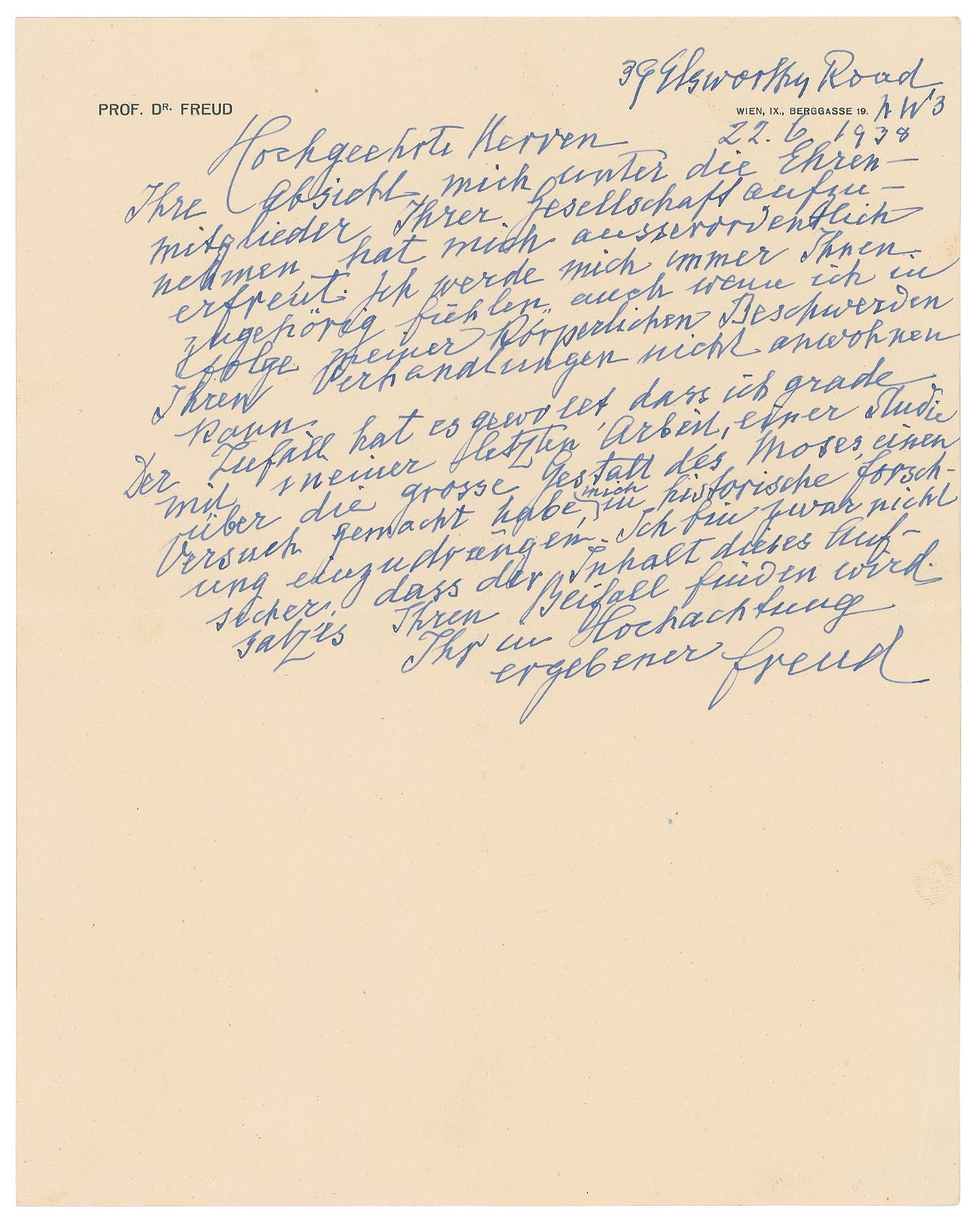 ALS in German, signed “Freud,” one page, 9 x 11.25, personal letterhead, June 22, 1938. Letter referencing his important 1939 book Moses and Monotheism, in full (translated): "Your intention of admitting me to honorary membership in your society has pleased me extremely. I will always feel I belong among you, even if I cannot attend your conferences as a result of my bodily ailments. As it so happens, I have just made an attempt to push my way into historical research with my latest work, a study on the great figure Moses. Of course, I am not sure that the content of this essay will meet your approval." In fine condition. Freud's last major work prior to his death, Moses and Monotheism, was published in 1939. In it, Freud hypothesized that Moses was not Hebrew but rather had been born into Ancient Egyptian nobility.