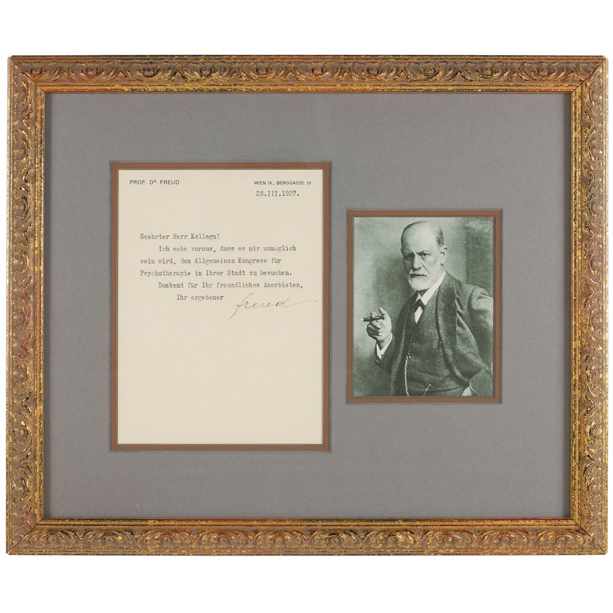TLS signed “Freud,” one page, 5.5 x 7.5, personal letterhead, March 25, 1927. Letter to a female colleague, in part: “As I said before, it will be impossible for me to come to the World Congress for Psychotherapy to be held in your town. Thank you for your friendly invitation.” Double-matted and framed with an image of the neurologist enjoying a cigar to an overall size of 16.5 x 13.75. In fine condition, with light surface impressions near the top edge. Founded in 1995, nearly seventy years after this letter was written, the World Congress of Psychotherapy is a triennially held convention highlighted by the bestowment of the Sigmund Freud Award on the basis of lifework, project development, and scientific publication. Freud was presumably unable to attend due to the imminent release of his 1927 book The Future of an Illusion, a short yet meditative psychoanalysis on religion’s need and basis within modern civilization.