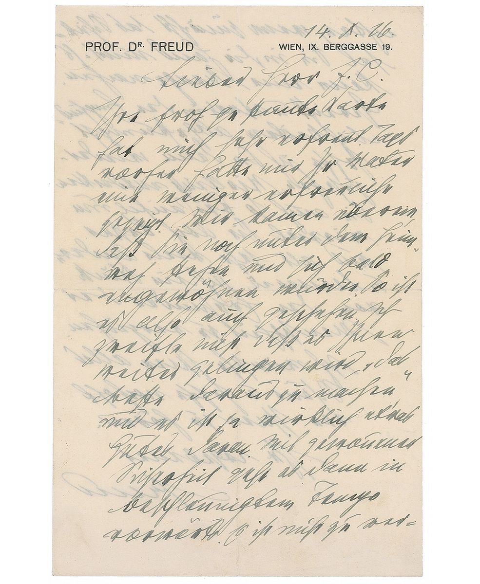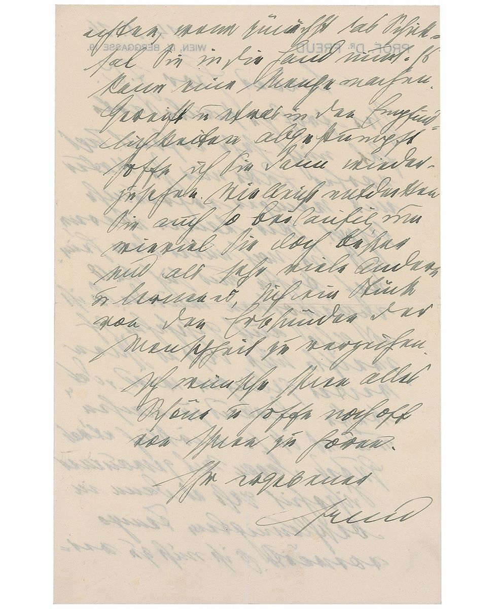 ALS in German, signed “Freud,” one page both sides, 5.25 x 8.25, personal letterhead, October 14, 1916. Letter to Austrian writer and lyric poet Arthur Fischer-Colbrie. In full (translated): “Your joyously tuned lute pleased me very much. The day before, your father fiddled a less joyful tune to me. We both came to the conclusion that you were still feeling homesick and that you would soon get used to it. And that’s how things have turned out. I have no doubt that you will successfully continue to ‘make the best of things’ and there is really something good in it. Once self-assurance is gained things will move forward at an accelerated pace. Do not be disdainful of Destiny’s having taken you in hand. It can do quite a lot. I hope to see you again matured and somewhat dulled in your sensibilities. Perhaps you’ll also discover incidentally how much better you are than a great many others and maybe you’ll have the courage to help yourself to a piece of the original sins of humanity. I wish all beautiful things to you and hope to continue to hear from you often.” In fine condition, with central horizontal and vertical folds and slight show-through from writing on opposing sides. Freud psychoanalyzed the writer in 1915–16 and then again in 1919 after Fischer-Colbrie’s military service, which had interrupted the analysis. Freud continued to write him to maintain their therapeutic contact.
