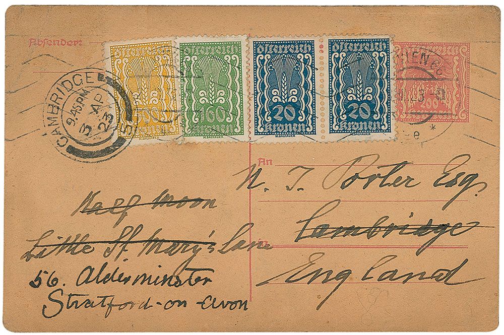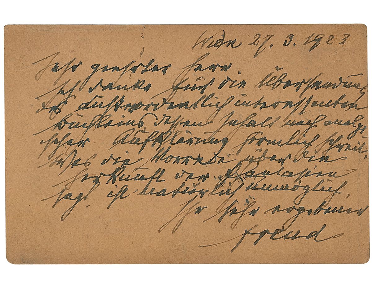 ALS in German, signed “Freud,” one page, 5.5 x 3.5, March 27, 1923. Letter to N. Teulon Porter about a book entitled Behind the Nightlight, by Joan Maude, as recorded by Nancy Price, purporting to recount the dreams and fantasies of Miss Maude, a three-year-old, as told to her mother. In full (translated): “Thank you for sending the extraordinarily interesting little book whose contents positively cry out for analytical interpretation. What the preface says about the origin of the fantasies is obviously impossible.” Postcard has been removably encapsulated in Mylar. Accompanied by a copy of the book, signed and inscribed to Porter by the author, with Porter’s bookplate affixed to the second free end page. In very good to fine condition, with uniform moderate toning and a bit of scattered light soiling. Price was an English stage actress, as was her daughter. A great example of Freud’s professional interest piqued by an unusual subject.