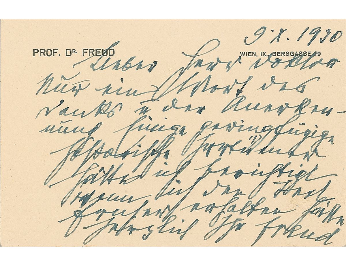 ALS in German, signed “Freud,” one page, 5.25 x 3.5, personal letterhead, October 9, 1930. Letter to an unidentified doctor. In full (translated): “Just one word of thanks for the recognition of some minor hasty errors I would have corrected had I received the text earlier.” In very fine condition. A particularly outstanding example, written in a very important year for Freud. In 1930, he won the prestigious Goethe Award and also published Civilization and Its Discontent, one of his most important and widely read works.