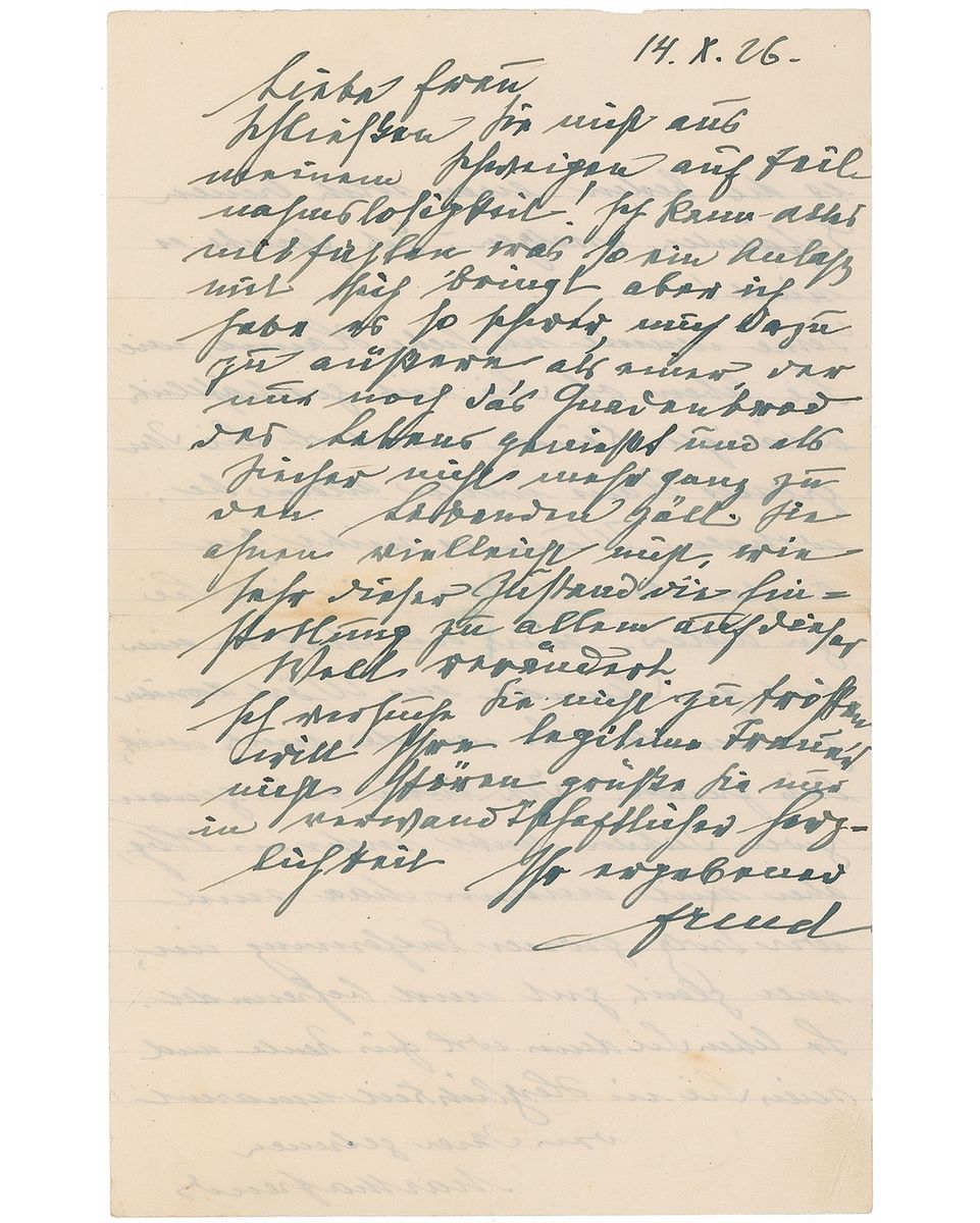 ALS in German, signed “Freud,” one page, lightly-lined, 5.25 x 8.5, October 14, 1926. Letter to a woman apparently suffering from cancer. In part (translated): “Please do not interpret my long silence as a lack of empathy on my part! I can absolutely identify with everything such an event engenders, I just find it very difficult to put my feelings into words, particularly as one who is no longer enjoying life in its fullness, and as one who certainly doesn’t count himself entirely among the living…You perhaps are unable to fathom the degree to which this condition changes a person’s general outlook in regard to everything in this world. I am not trying to console you, and do not wish to disturb your legitimate grief, I only offer my heartfelt regards as your kin.” On the reverse is the last page of a letter written by his wife, signed “Martha Freud,” in part (translated): “I would love to learn, dear Hanna, how you are doing now…in our hearts we are close and enjoy our deep friendship despite the great distance between us.” In fine condition, with central vertical and horizontal folds and a few smalls stains.