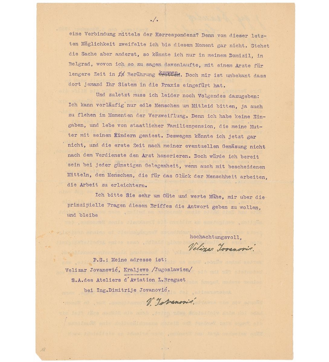 Brief ANS in German, signed “Freud,” at the top of a typed letter written to Freud by a 30-year-old seeking analysis, one page both sides, 8.5 x 11.5, December 13, 1933. Freud writes (translated): “Please answer this. Freud. 13/XII 33." The aspiring patient writes, in part (translated): "I beg you to excuse my taking the liberty to address you as a psychoanalyst and human being for the help that I need as much as my daily bread…You may not be able to render assistance personally, for you are a man who has worked much and who would have the right to rest…I would be most grateful if you could kindly recommend another person to me. One who would have the kindness and time to heal a man, or if that is not possible, to at least lessen the illness of a man, who despite his entire unproductive past remains faithful yet in his thirtieth year that his ability to work in the field of higher music would be of value to all mankind…I must add the following: I can currently only beg noble souls for compassion…For I have no income, and live on the Government’s pension…For this reason, I could not now…pay the physician what is his just due.” Central vertical and horizontal folds with a couple small edge separations, and mild toning, otherwise fine condition. Accompanied by a full translation. An exceptionally desirable example directly pertaining to his work.