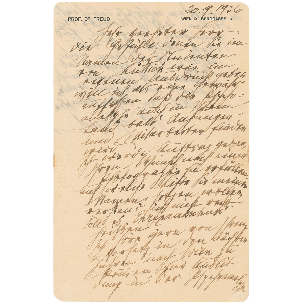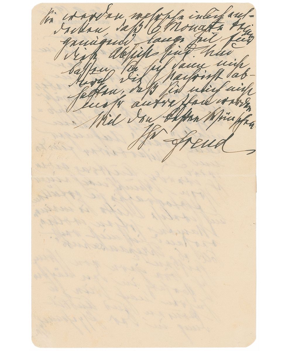ALS in German, signed “Freud,” one page both sides, 6 x 9, personal letterhead, September 20, 1936. Letter to an aspiring Belgian psychiatrist desiring to study with Freud. In part (translated): “I will take the feelings you express to me on behalf of the students in Liege and in your own name as a guarantee that in your country too, psychoanalysis will soon find followers and collaborators. I will make sure that your request for a photograph will be taken care of. I didn’t quite understand which list you want to put my name on. Is it supposed to be called an ‘Honorary Committee’? I am glad to hear about your intention to come to Vienna in a few years in order to get training in psychoanalysis. You’ll probably find out for yourself that six months won’t be sufficient time for that purpose. And don’t be put off if you hear the news that you won’t find me here anymore.” In fine condition, with trivial tape remnants to edges.