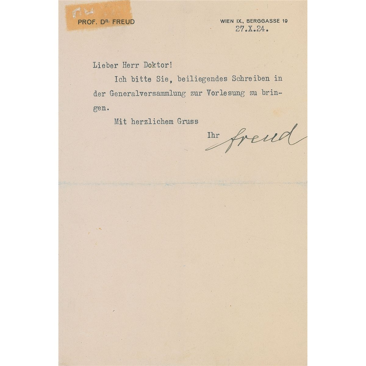TLS in German, signed “Freud,” one page, 6 x 8.75, personal letterhead, October 27, 1924. Letter to Austrian psychoanalyst Paul Federn. In full (translated): “With this letter I ask you to bring all your opinions on the attached letter during the General Committee.” A dark block of toning and staple holes to upper left, and light overall wrinkling, otherwise fine condition. Federn became one of Freud’s earliest followers and most ardent supporters after reading his Interpretation of Dreams. After Freud was diagnosed with cancer of the jaw in 1923, he underwent surgery that deprived him of speech for weeks. Federn was appointed as his official representative, speaking at meetings of the Vienna Psychoanalytic Society on the great psychoanalyst’s behalf along with Anna Freud. A desirable letter closely associated with Freud’s work, highlighted by its bold, crisp signature.