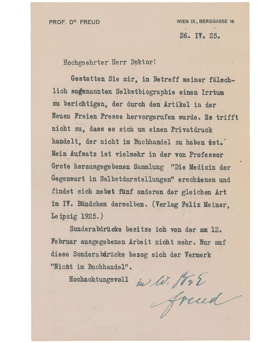 TLS in German, signed “Freud,” one page, 5.75 x 9, personal letterhead, April 29, 1925. Letter to a doctor. In full (translated): “Permit me to correct an error that appeared in the article in the ‘Neue Freie Presse’ regarding my so-called autobiography. It is not correct that this is a private publication not available commercially. On the contrary, my article has appeared in the collection ‘Die Medizin der Gegenwart in Selbstdarstellungen’ [‘Modern Medicine in Self-Portraits’] published by Professor Grote and may be found with five others of the same sort in the fourth volume [Verlag Felix Meiner, Leipzig 1925]. I no longer have any reprints of the lecture published on February 12. The remark ‘not available in the book trade’ referred only to the reprints.” In fine condition, with light creases and toning.