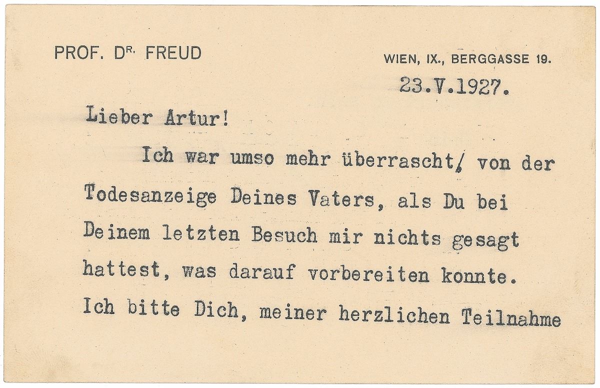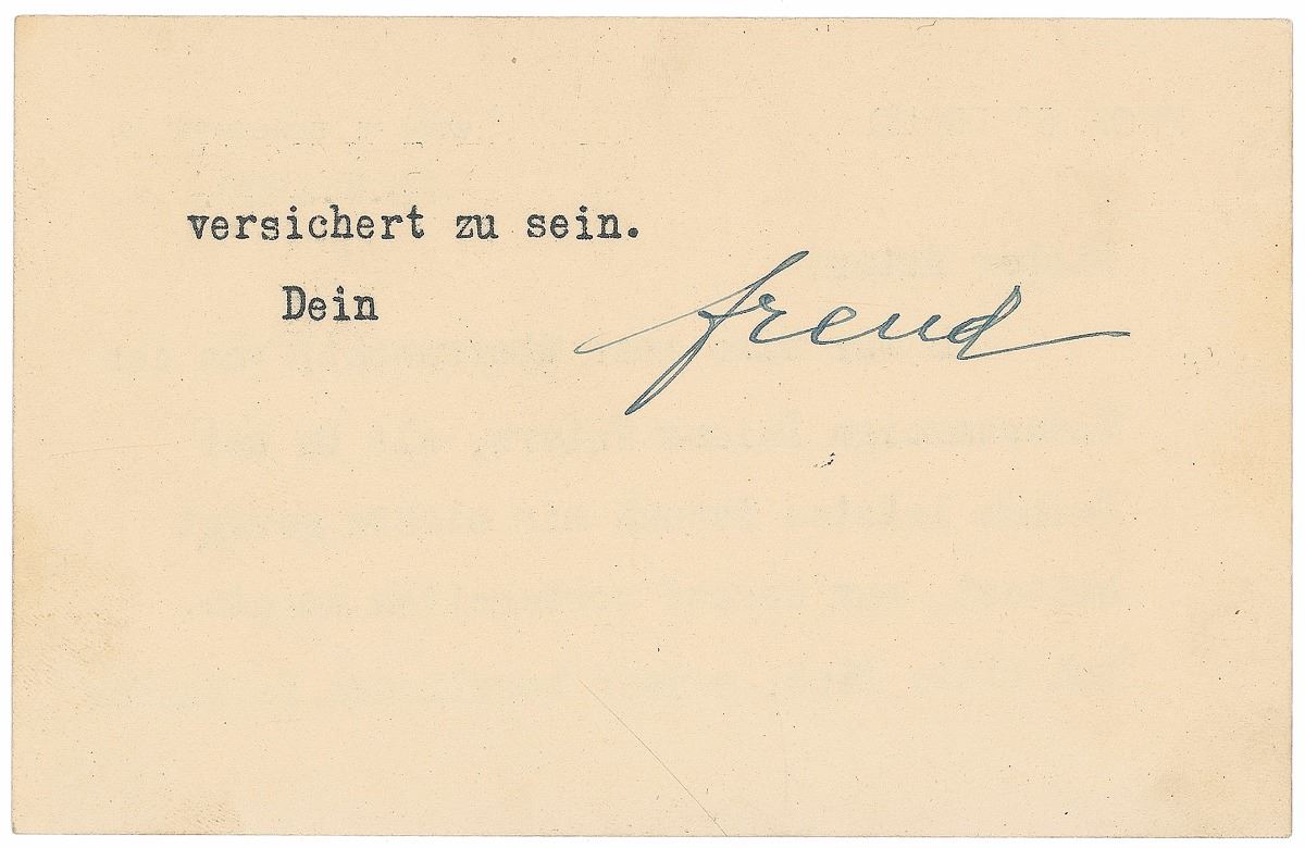 TLS in German, signed “Freud,” one page both sides on a 5.25 x 3.25 personal stationery card, May 23, 1927. Letter of condolences to his friend, Arthur, in full (translated): “I was more than surprised to see your father’s obituary, as you had not mentioned anything to me the last time we met. I beg you to be assured of my heartfelt feelings.” In fine condition. An especially crisp signature from the father of psychoanalysis.