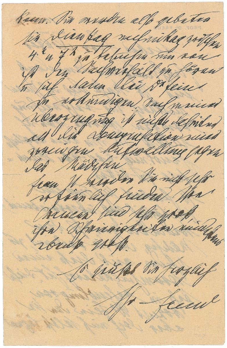 ALS in German, signed “Freud,” one page, 5.25 x 8.25, personal letterhead, June 10, 1912. Letter to a fellow doctor, in full (translated): "Simultaneously with my thanking you for your musical score that I shall be bringing with me to our meeting on Wednesday, I am requesting your presence for one to be remunerated co-consultation in the case of Mrs. Hirschfeld. I am dealing here with a (of course highly exaggerated) compulsion on her part of harming her servant girl because that girl is suffering of bronchial catarrh, which has been diagnosed by Prof. Dr. Fein, a diagnosis Mrs. Hirschfeld is rejecting. You are herewith kindly requested to arrive on Tuesday afternoon between 4:00 and 7:00 to visit the patient, letting her tell you her side. You can subsequently discuss with Dr. Fein the details of the case. In my professional opinion, there is no basis for her compulsion for aggression towards the girl. You are not likely to find Mrs. H. in a pleasant frame of mind. Her traumata are significant, her difficulties dealing with them are at least as considerable.” In fine condition, with writing showing through from opposing sides.